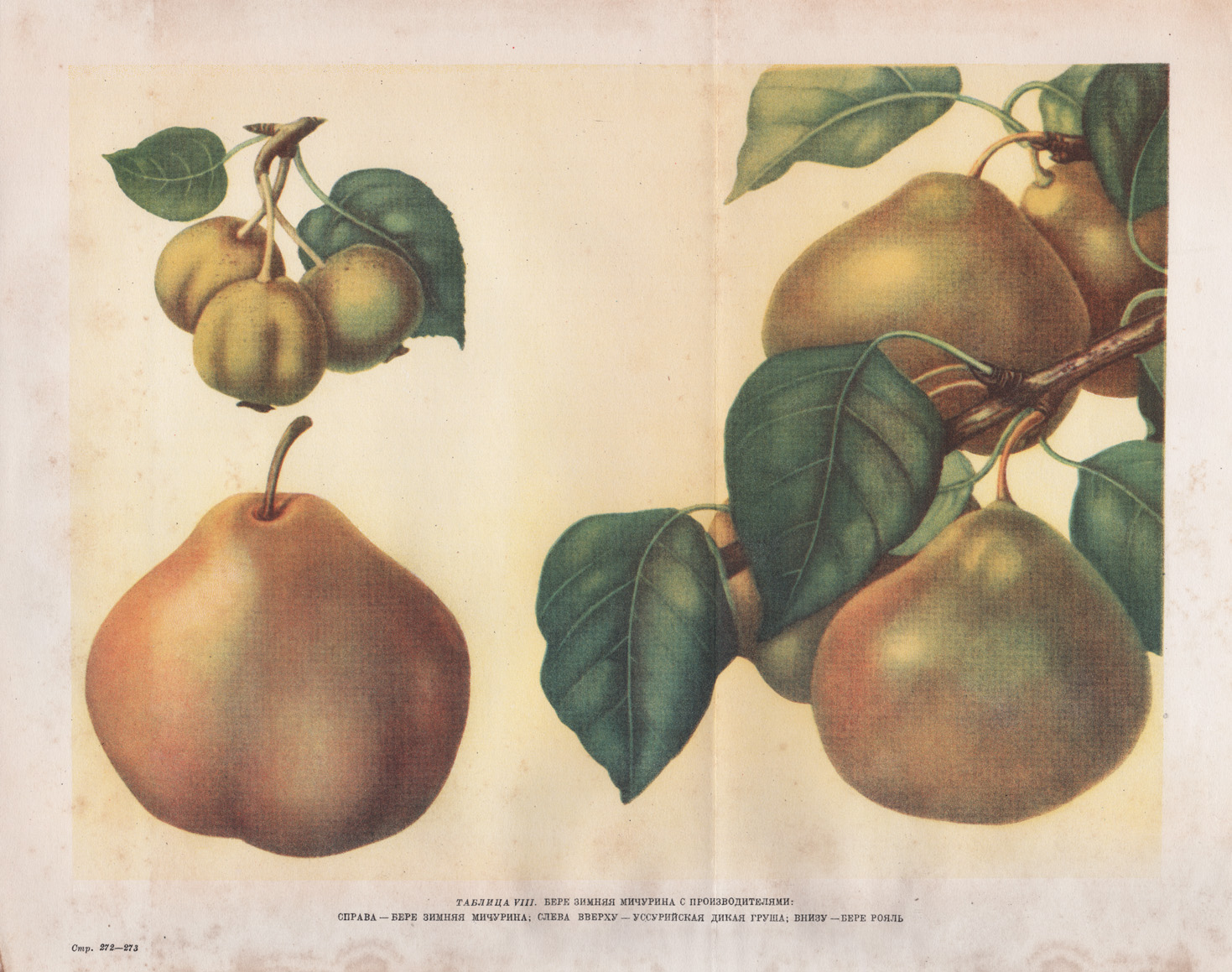 Пятый сеянец, названный мною Бере зимняя Мичурина, удачно соединил и в свойствах дерева и в качестве своих плодов достоинства обоих растений-производителей в той комбинации, благодаря которой этот новый сорт настоящей зимней груши, без сомнения, будет оценен как перворазрядный, очень хороший для садов средней и отчасти даже и северной полос СССР.