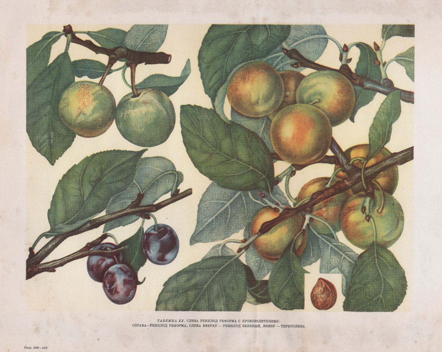 Размер листа прим. 32,3 х 25,8 см. Слива Ренклод реформа с производителями: справа — Ренклод реформа; слева вверху — Ренклод зеленый, внизу — тернослива. Автотипия с матриц 1-ой Образцовой типографии им. А.А. Жданова треста "Полиграфкнига" ОГИЗа по заказу Сельхозгиза в 1949 году в Москве.