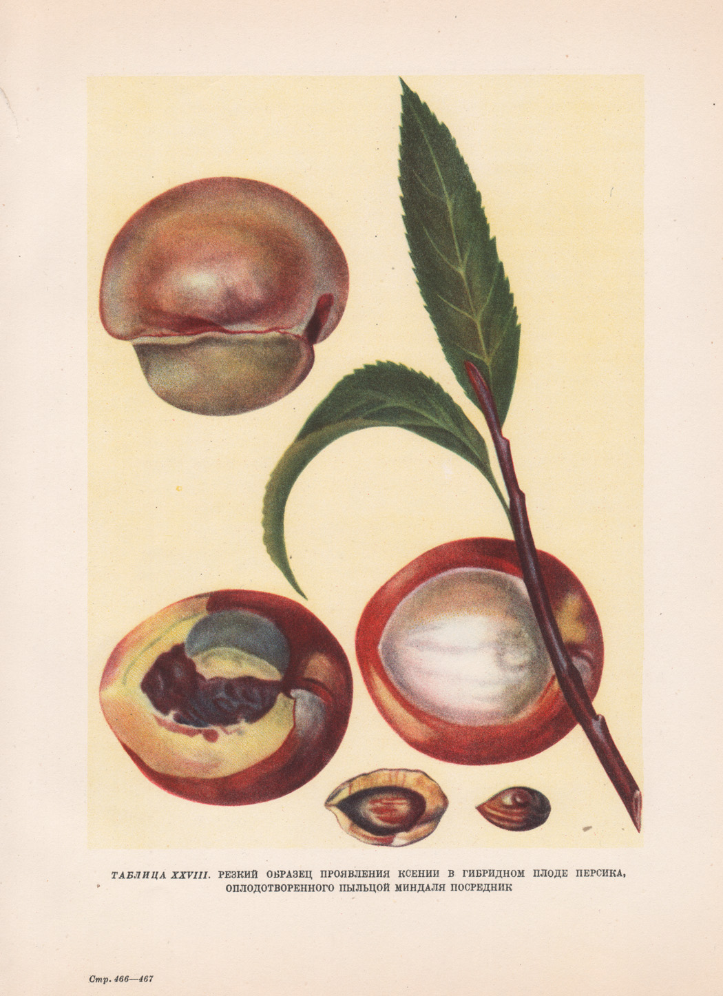 Размер листа прим. 25 х 20 см. Резкий образец проявления ксении в гибридном плоде персика, оплодотворенного пыльцой миндаля Посредник. Отпечатано с матриц 1-ой Образцовой типографии им. А.А. Жданова треста "Полиграфкнига" ОГИЗа по заказу Сельхозгиза в 1949 году в Москве.