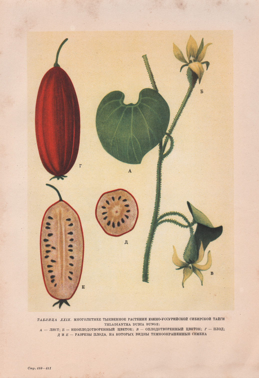 Таблица XXIX. Многолетнее тыквенное растение южно-уссурийской сибирской тайги thladiantha dubia bunge: а - лист; б - неоплодотворенный цветок; в - оплодотворенный цветок; г - плод; д и е - разрезы плода, на которых видны темноокрашенные семена