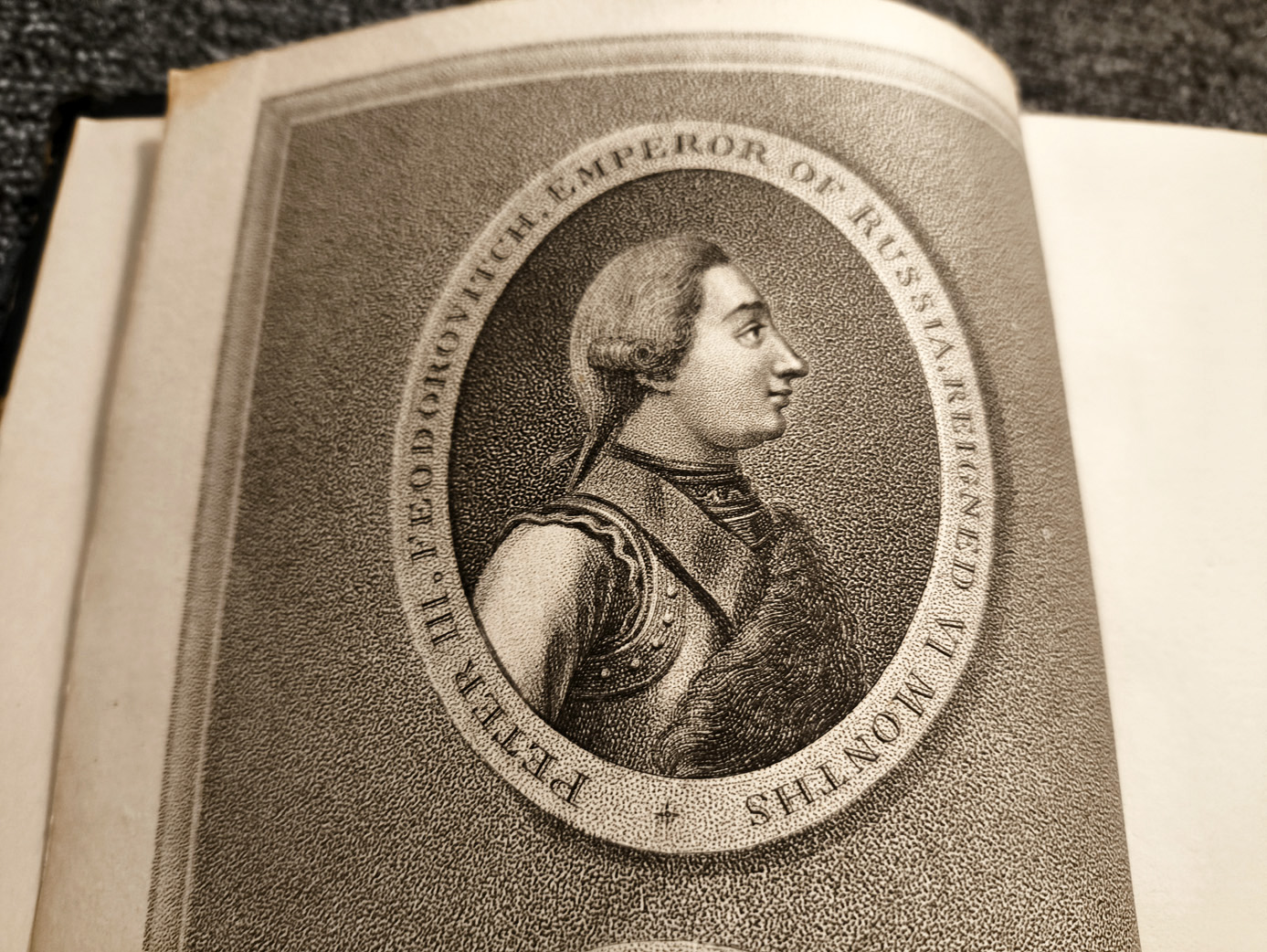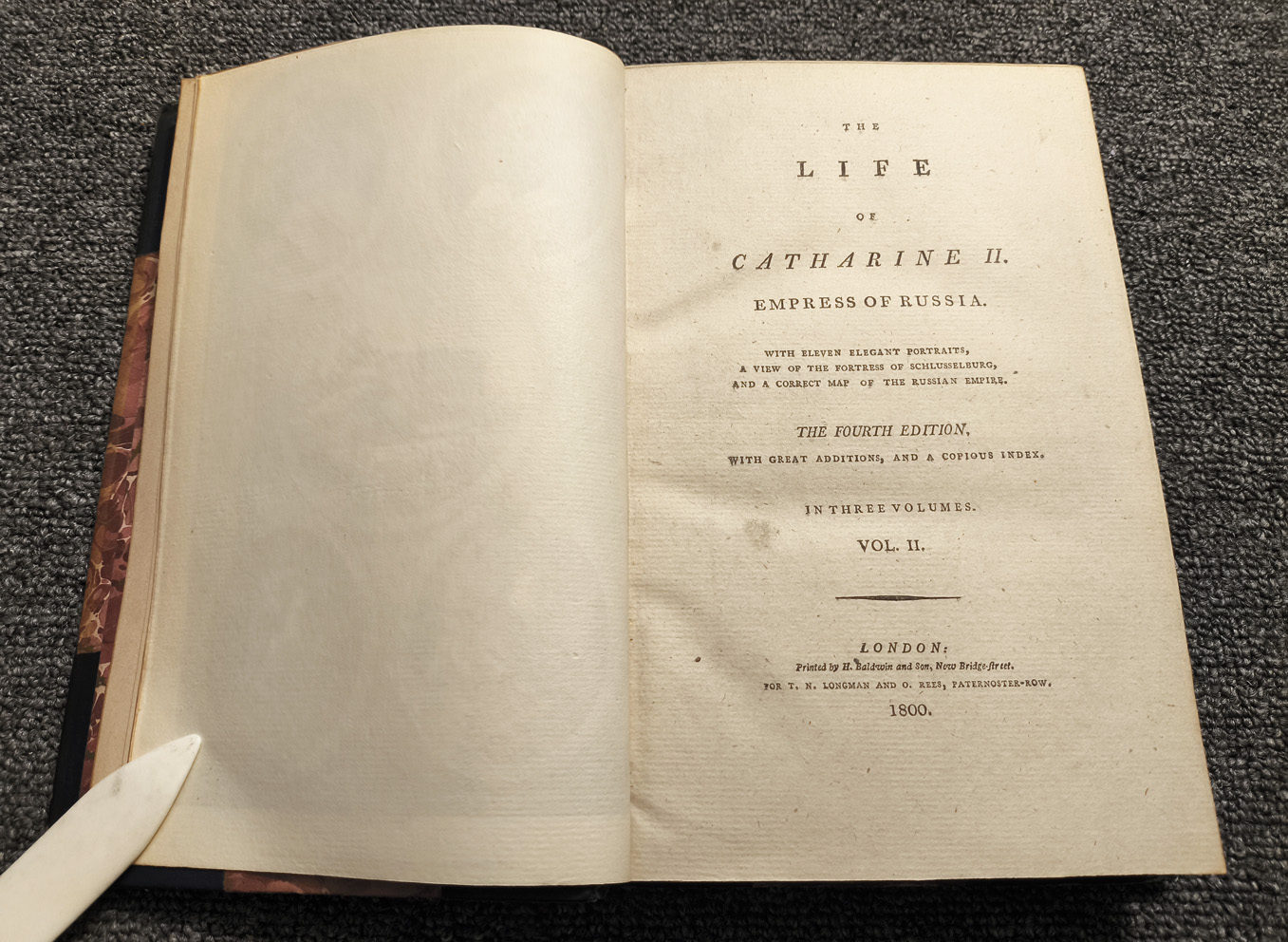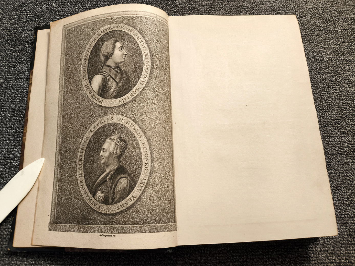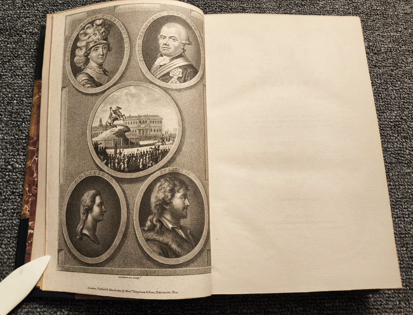 В трех томах. Размер каждого тома примерно 21,3 х 14 х 3 см, 520 + 488 + 568 стр. Содержит три гравированных фронтисписа с изображением 11 портретов и видом на памятник Петру I в Санкт-Петербурге и лист с изображением музыкальных нот. Издание включает таблицы генеалогического древа российских монархов. Четвертое издание с многочисленными дополнениями и подробным указателем. Текст на английском языке. Лондон: Напечатано А. Страханом на Принтерс-стрит, для Т.Н. Лонгмана и О. Риса, Патерностер-Роу, 1800 год.