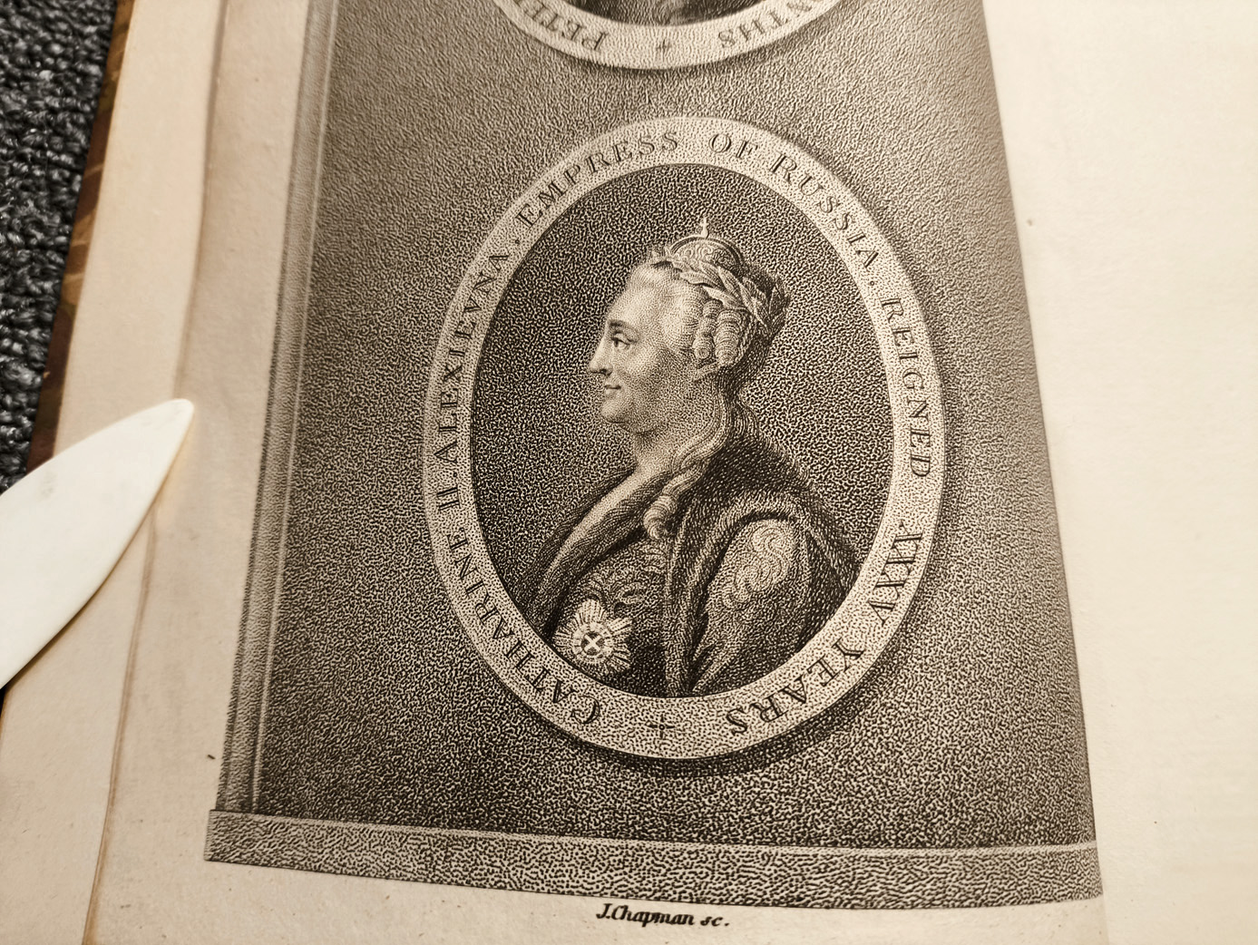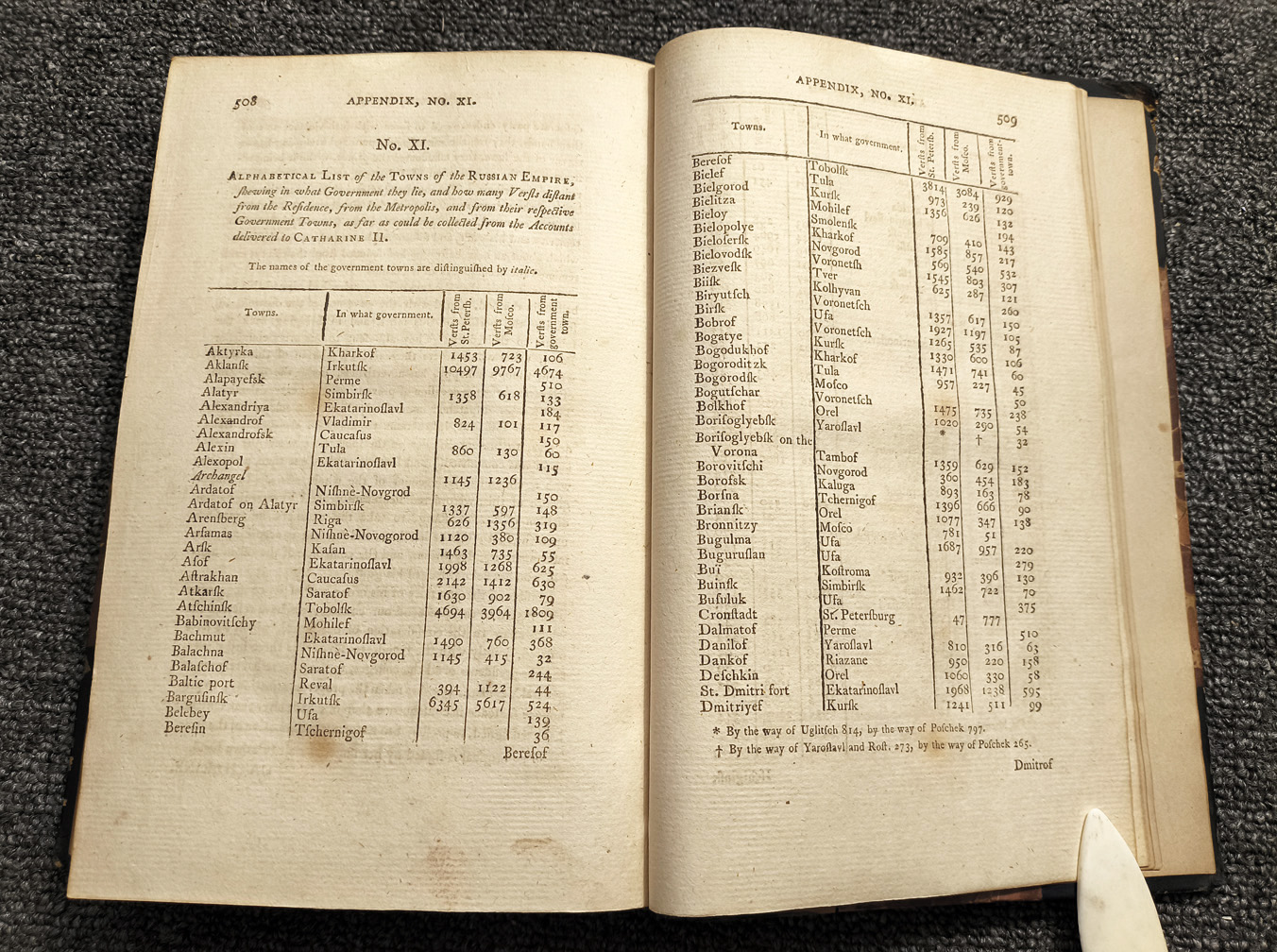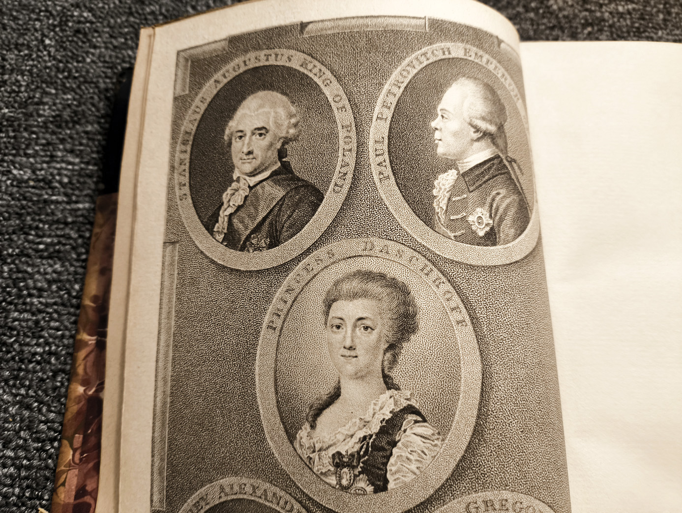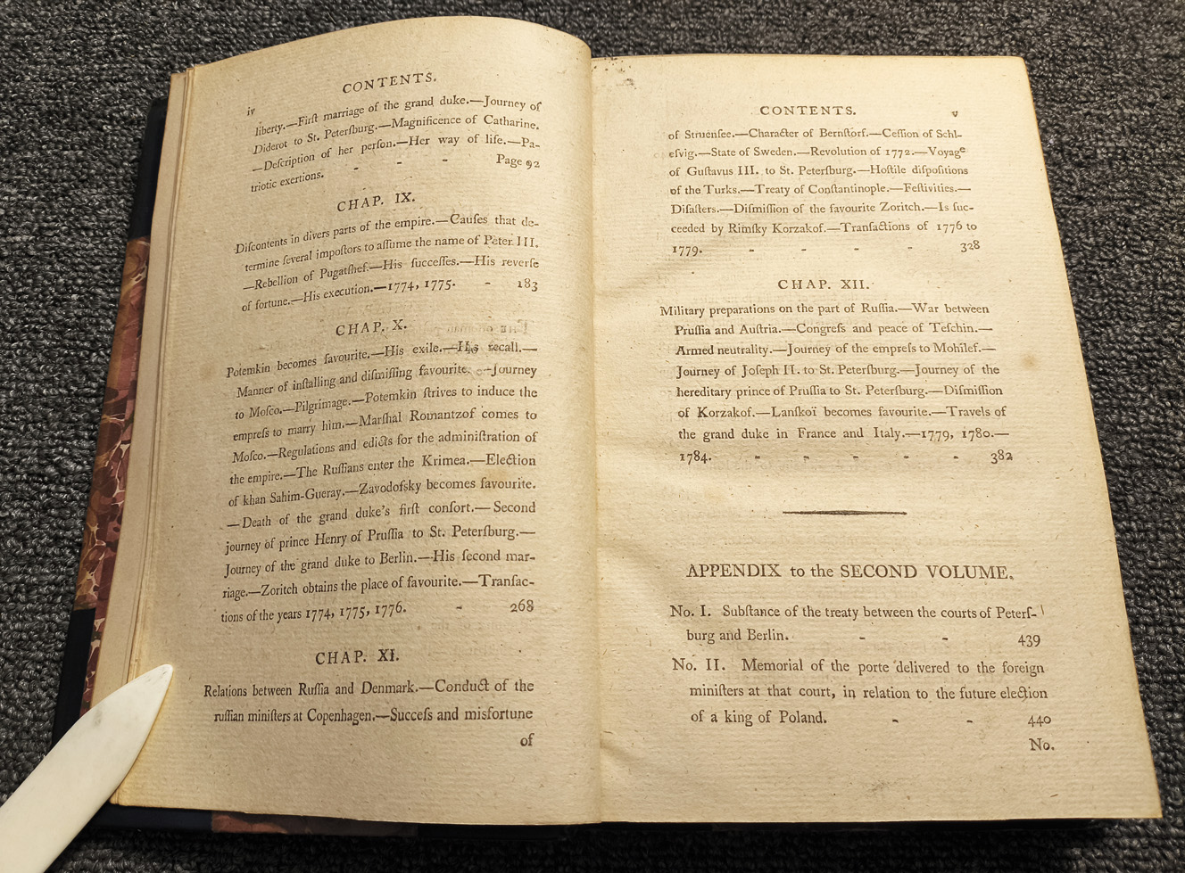 В трех томах. Размер каждого тома примерно 21,3 х 14 х 3 см, 520 + 488 + 568 стр. Содержит три гравированных фронтисписа с изображением 11 портретов и видом на памятник Петру I в Санкт-Петербурге и лист с изображением музыкальных нот. Издание включает таблицы генеалогического древа российских монархов. Четвертое издание с многочисленными дополнениями и подробным указателем. Текст на английском языке. Лондон: Напечатано А. Страханом на Принтерс-стрит, для Т.Н. Лонгмана и О. Риса, Патерностер-Роу, 1800 год.