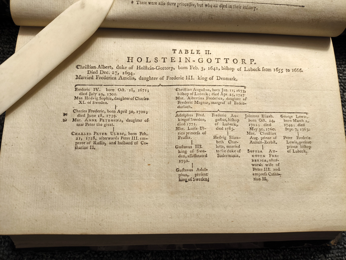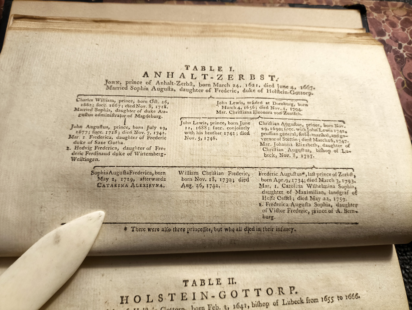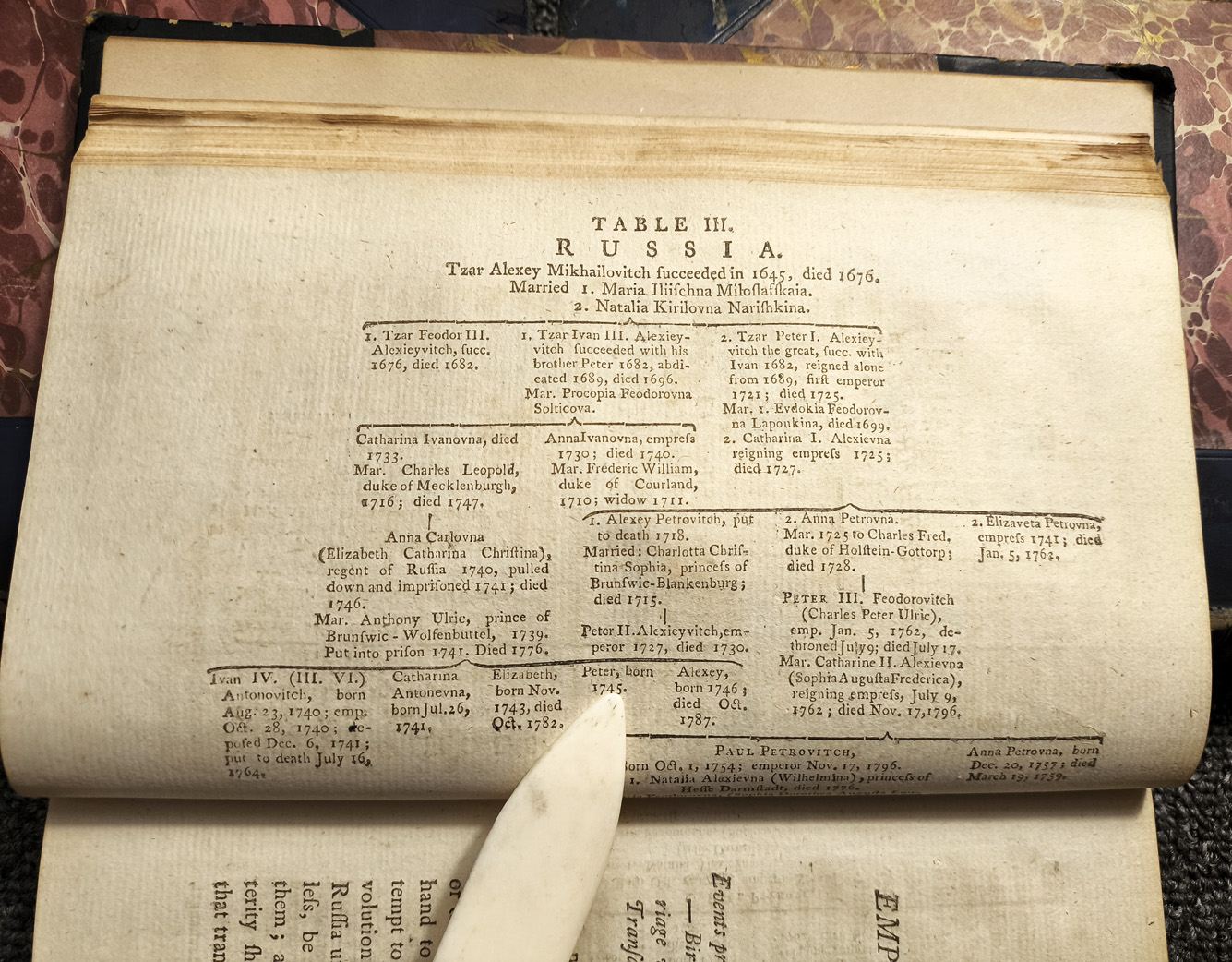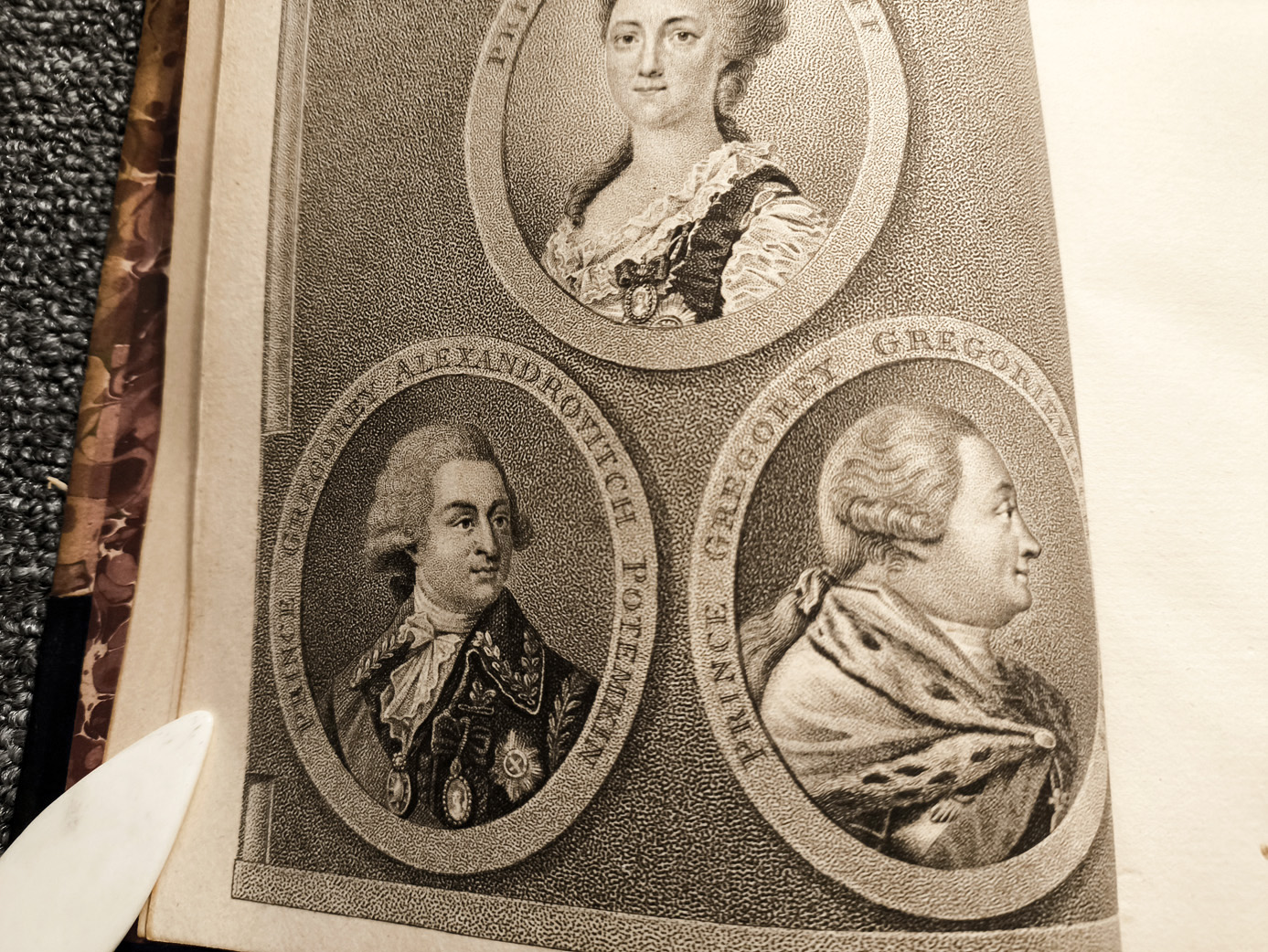 В трех томах. Размер каждого тома примерно 21,3 х 14 х 3 см, 520 + 488 + 568 стр. Содержит три гравированных фронтисписа с изображением 11 портретов и видом на памятник Петру I в Санкт-Петербурге и лист с изображением музыкальных нот. Издание включает таблицы генеалогического древа российских монархов. Четвертое издание с многочисленными дополнениями и подробным указателем. Текст на английском языке. Лондон: Напечатано А. Страханом на Принтерс-стрит, для Т.Н. Лонгмана и О. Риса, Патерностер-Роу, 1800 год.