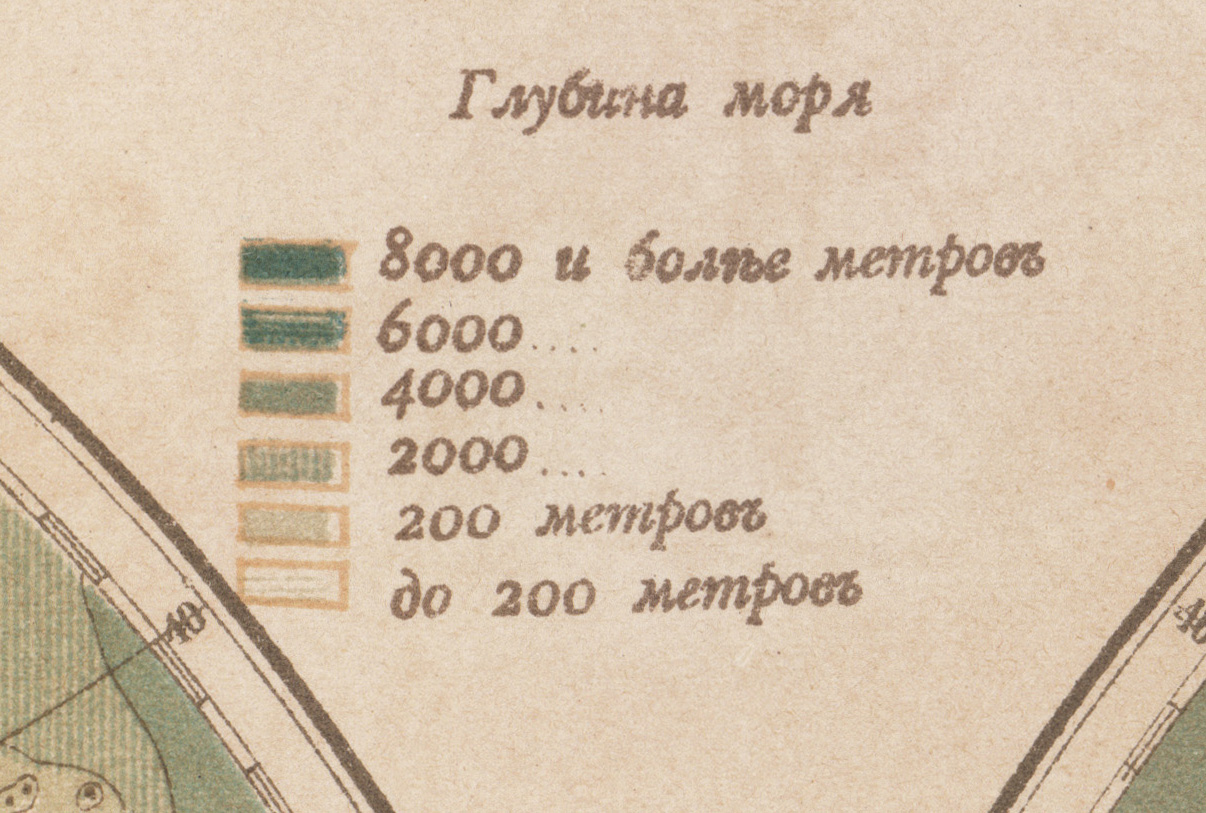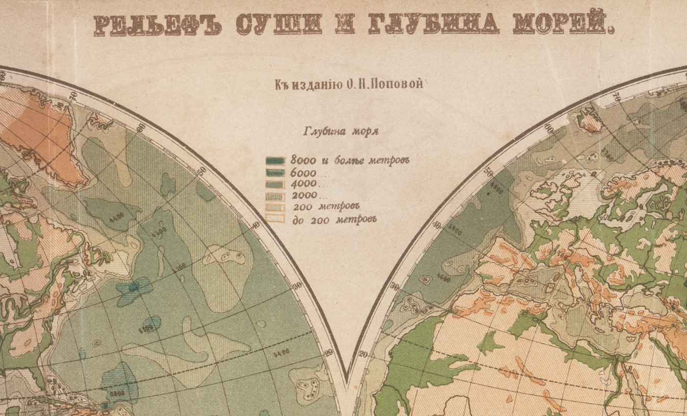 Размер карты 42.2 х 27.3 см. Чистая обратная сторона листа. "Рельеф суши и глубина морей", издание О.Н. Поповой, Школьная картопечатня Новгородской губернии, отпечатано для русского издания сочинения Элизе Реклю "Земля, описание жизни земного шара", 1895 год.
