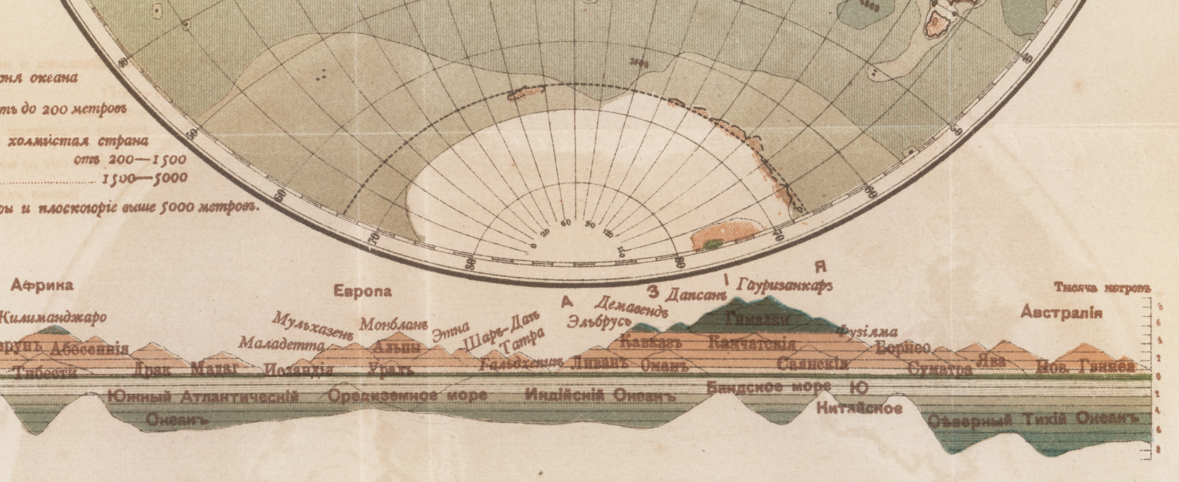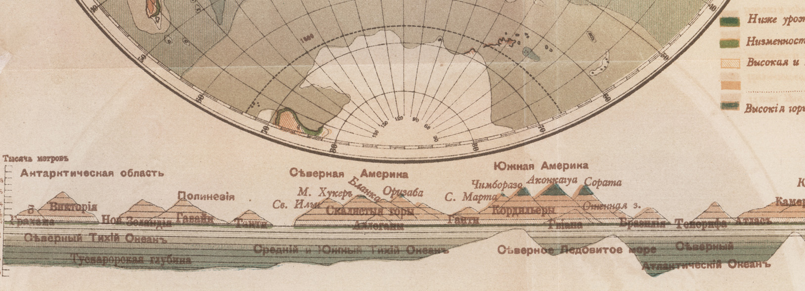 На карте цветом показаны глубины морей до 8000 метров и рельеф суши - ниже уровня океана, низменности, высокие и холмистые места, высокие горы и плоскогорья выше 5000 метров.