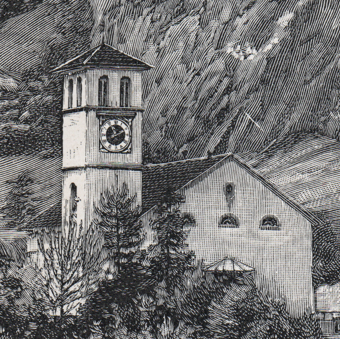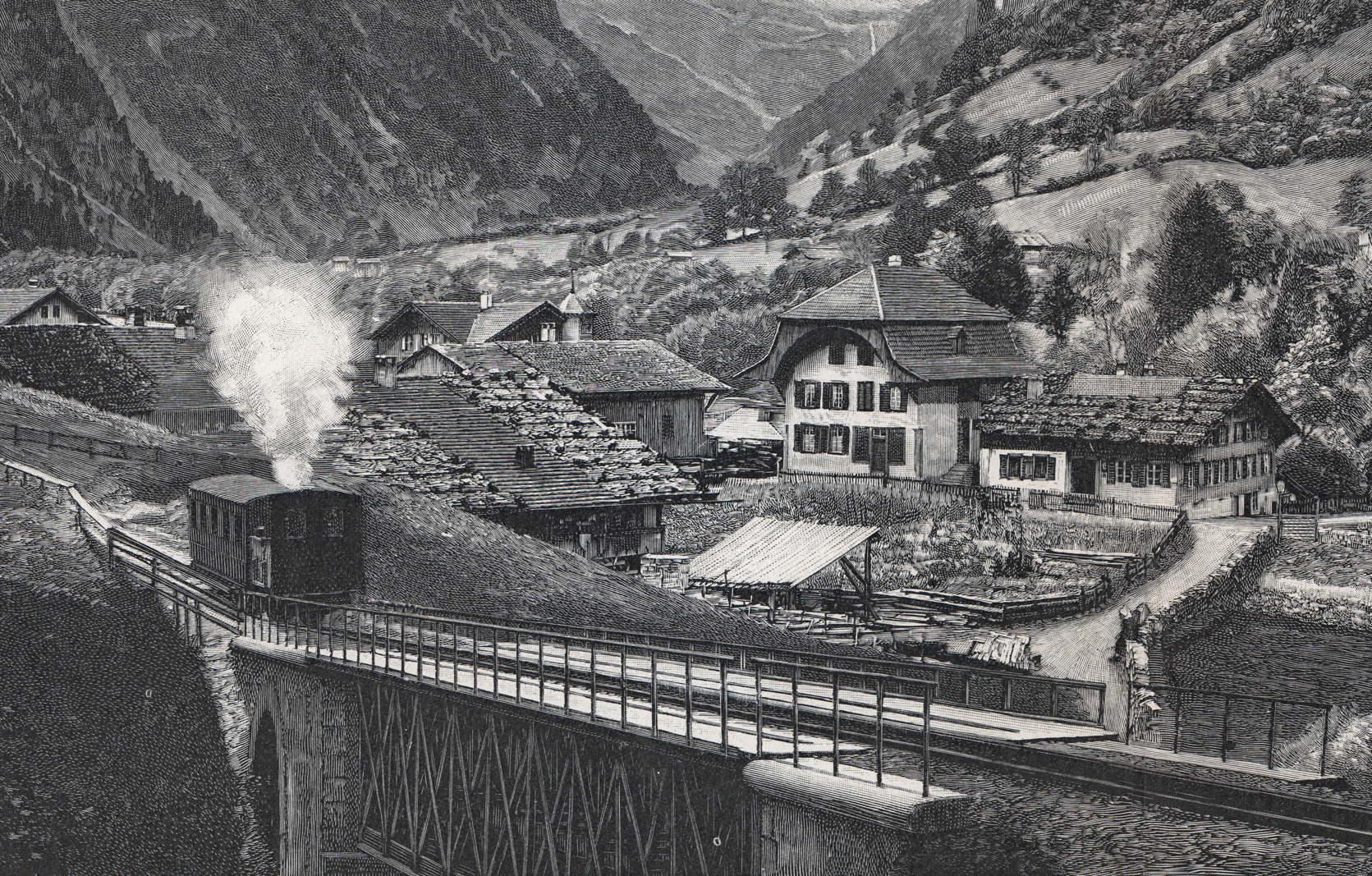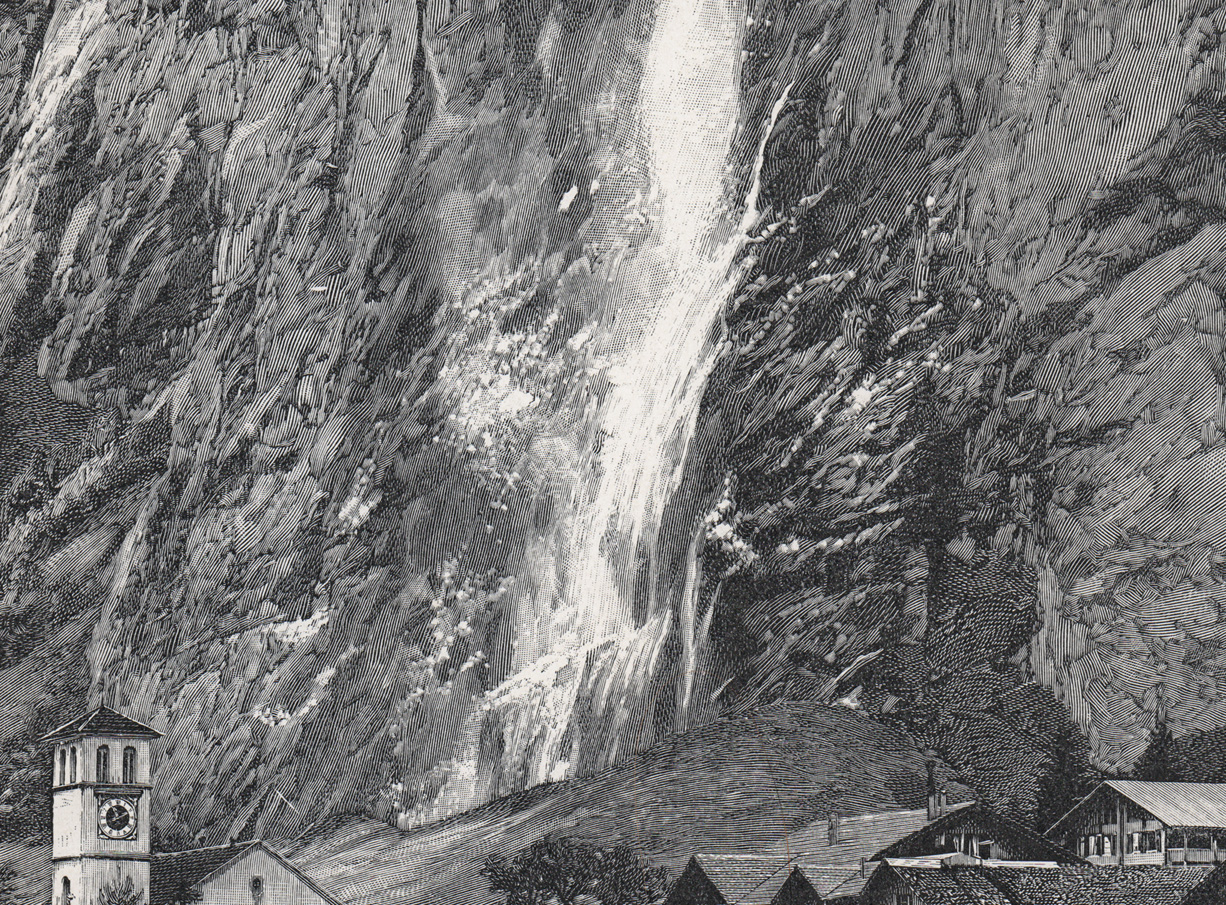 На гравюре показан водопад Штауббах у деревни Лаутербруннен в кантоне Берн, Швейцария. Высота Штауббаха составляет почти 300 метров. До апреля 2006 года он считался самым высоким водопадом Швейцарии, пока новые измерения не установили первенство Зеренбахского водопада. Когда Иоганн Вольфганг фон Гёте посетил долину Лаутербруннен в 1779 году, он сделал этот водопад знаменитым, посвятив ему своё произведение «Песнь духов над водами». Водопад посетил в 1789 году и описал Н. Карамзин в "Письма русского путешественника".
