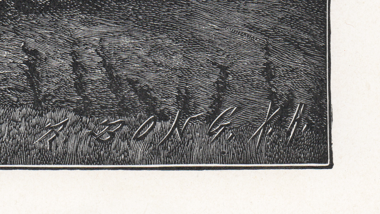 Большой размер листа 57,4 х 40,7 см. Подлинная старинная немецкая ксилография 1903-04 гг печати оттиском с гравированной деревянной доски. Гравёр Рихард Бонг. Хорошее коллекционное состояние гравюры. Чистая обратная сторона. Гравюра увеличенного формата из немецкой серии "Современное искусство в мастер-ксилографиях (гравюры оттиском с гравированных деревянных досок) живописных работ и скульптур известных мастеров современности", отпечатана в Берлине, в типографии "Verlag von Rich.Bong" в 1903-04 году.