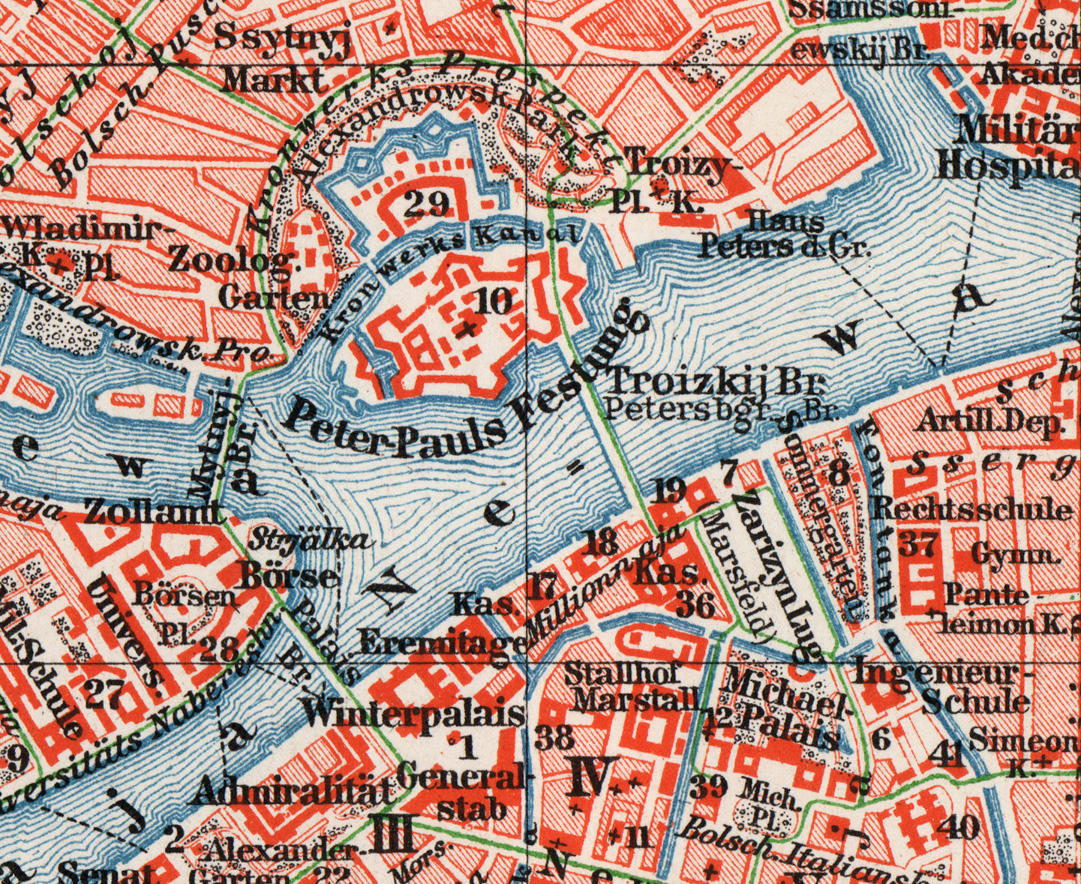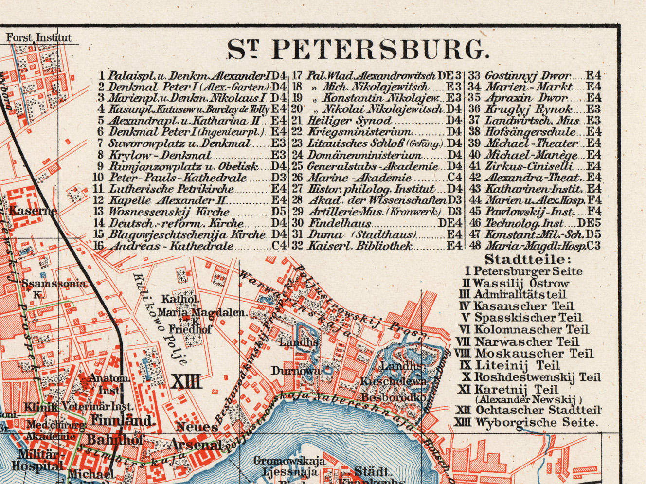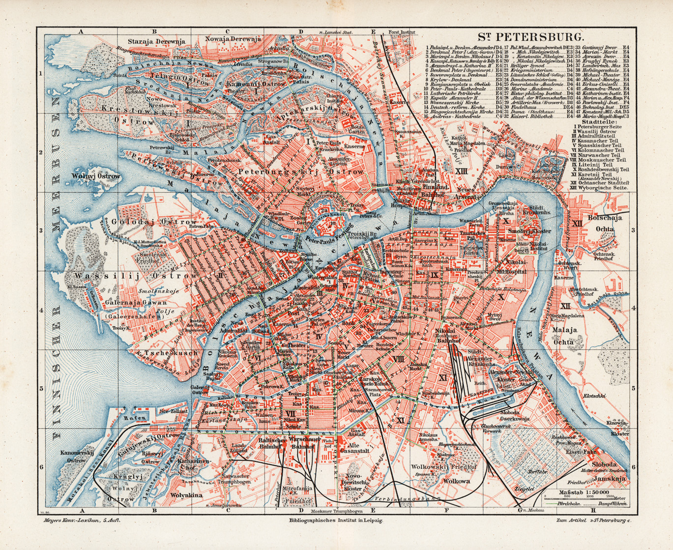 Размер рамы 44 х 40,6 см. Отличное коллекционное состояние карты. Печать в три цвета, масштаб 1:50000. Дата печати плана указана в левом нижнем углу - июль 1896 года "VII 96". Эта карта издания "Лексикона Мейера", отпечатана в издательстве "Библиографический Институт" в Лейпциге. Все названия написаны латиницей в производной от русского произношения: к примеру Newskij Prospekt - Невский Проспект. Карты Санкт-Петербурга выпущенные до конца первой половины XX столетия чрезвычайно редки и украсят любую коллекцию. А обрамленная карта послужит интересным антикварным подарком Вашему начальнику или партнёру, украсит рабочий кабинет или офис компании.