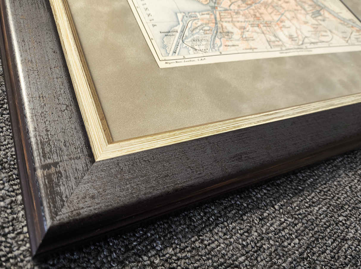 Современное обрамление в коллекционный багет из натурального дерева, картон-паспарту с бархатным покрытием и резом черного тона, тонкое багетное стекло "Фениция", верхний подвес карты бескислотной консервационной лентой, задник из паспарту, пылевая защита, подвес рамы - трос, гарантийный сертификат-аннотация на обратной стороне рамы.