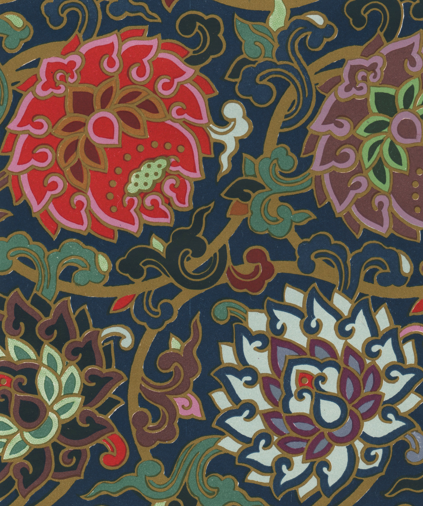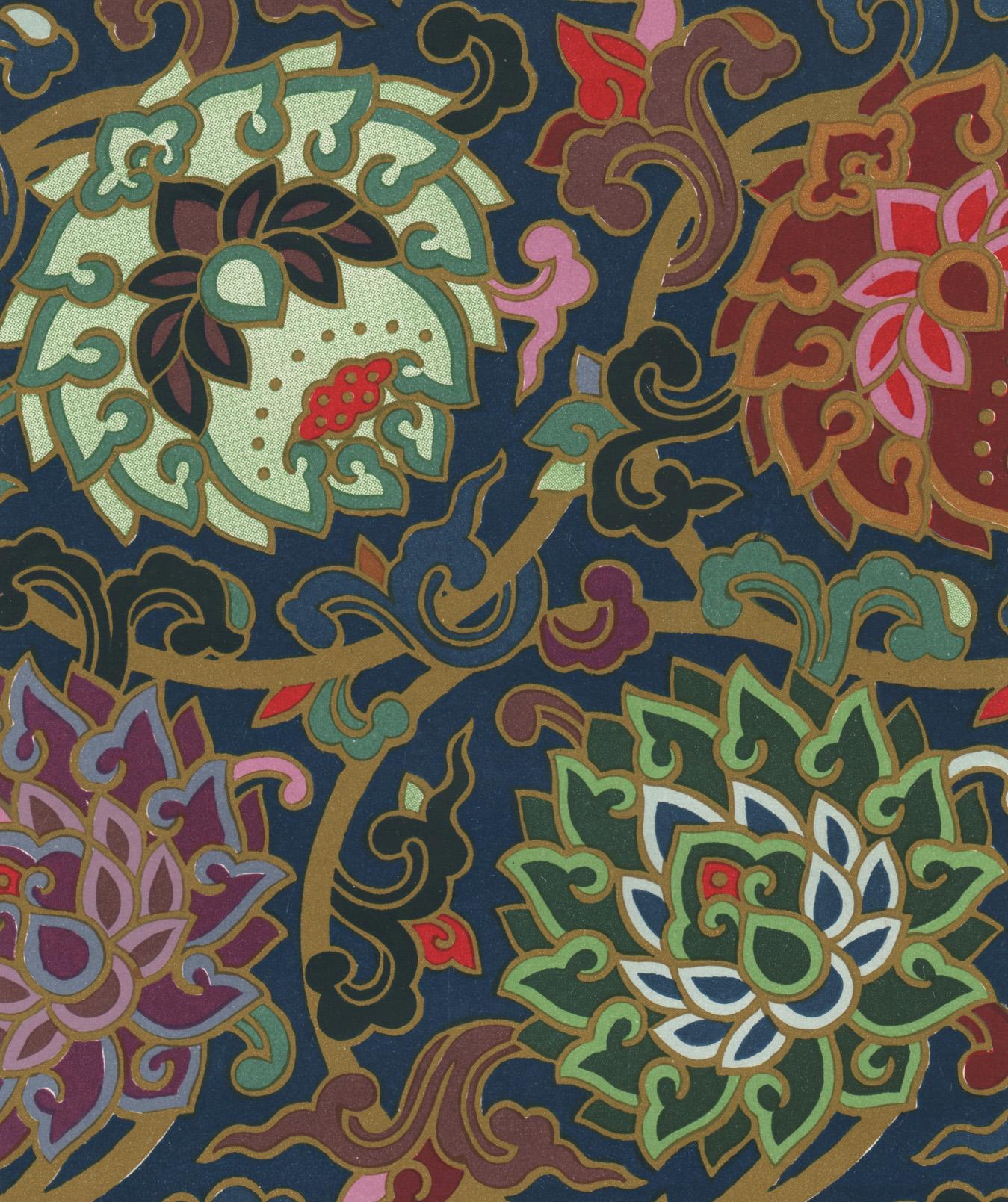 Размер листа 36,6 х 25,9 см. Редкость. Лист с изображением уникального узора традиционной китайской облачной парчи Юньцзинь (ткани из шелка с нитями из серебра и золота) издания "Узор парчи", составитель Нанкинский научно-исследовательский институт Юньцзинь, редактор Чэнь Чжифо, издатель "Книжный магазин Синьхуа", отпечатано в типографии издательства "Китайское классическое искусство", в Пекине, в 1959 году, тиражом 1500 экземпляров.