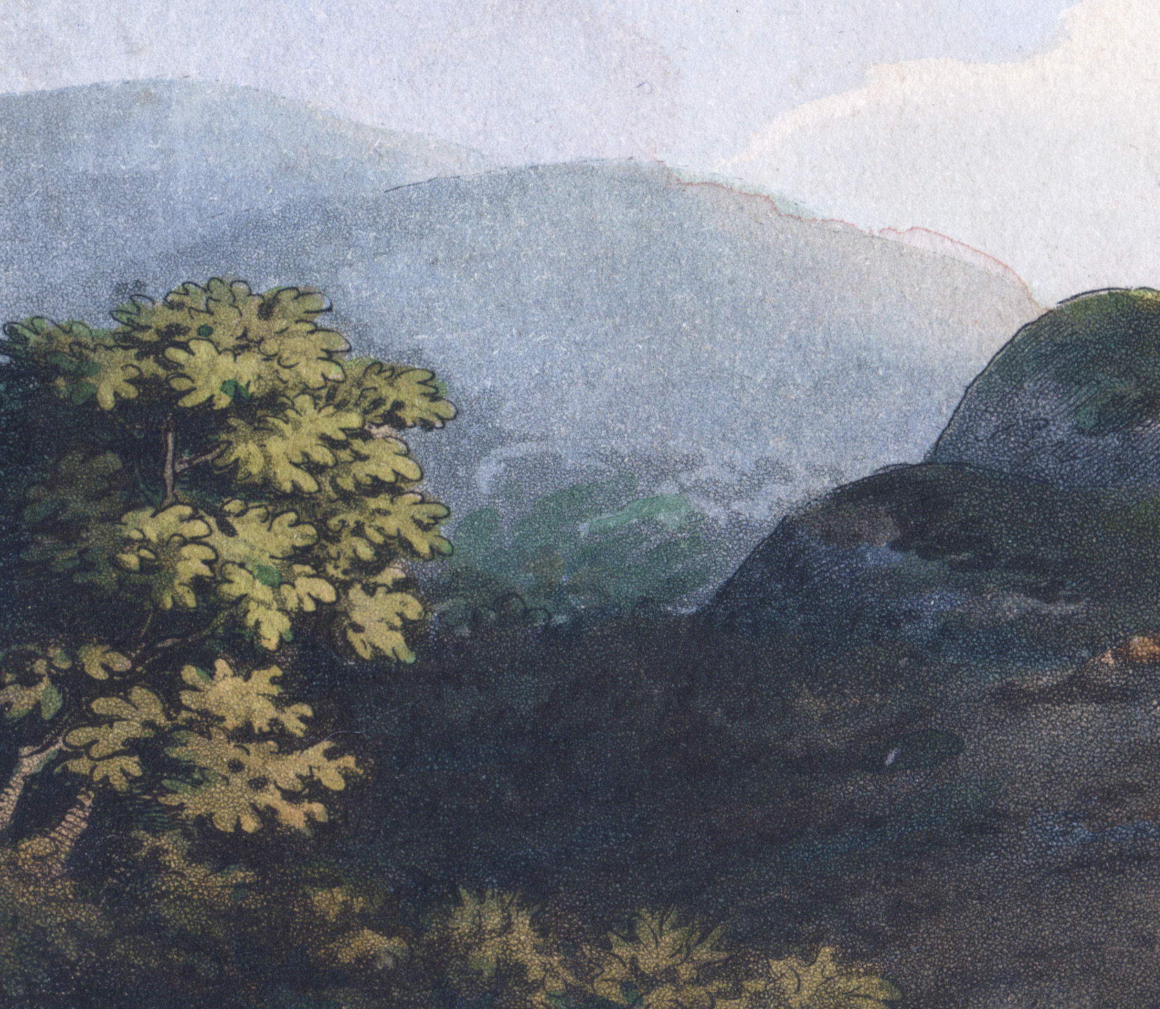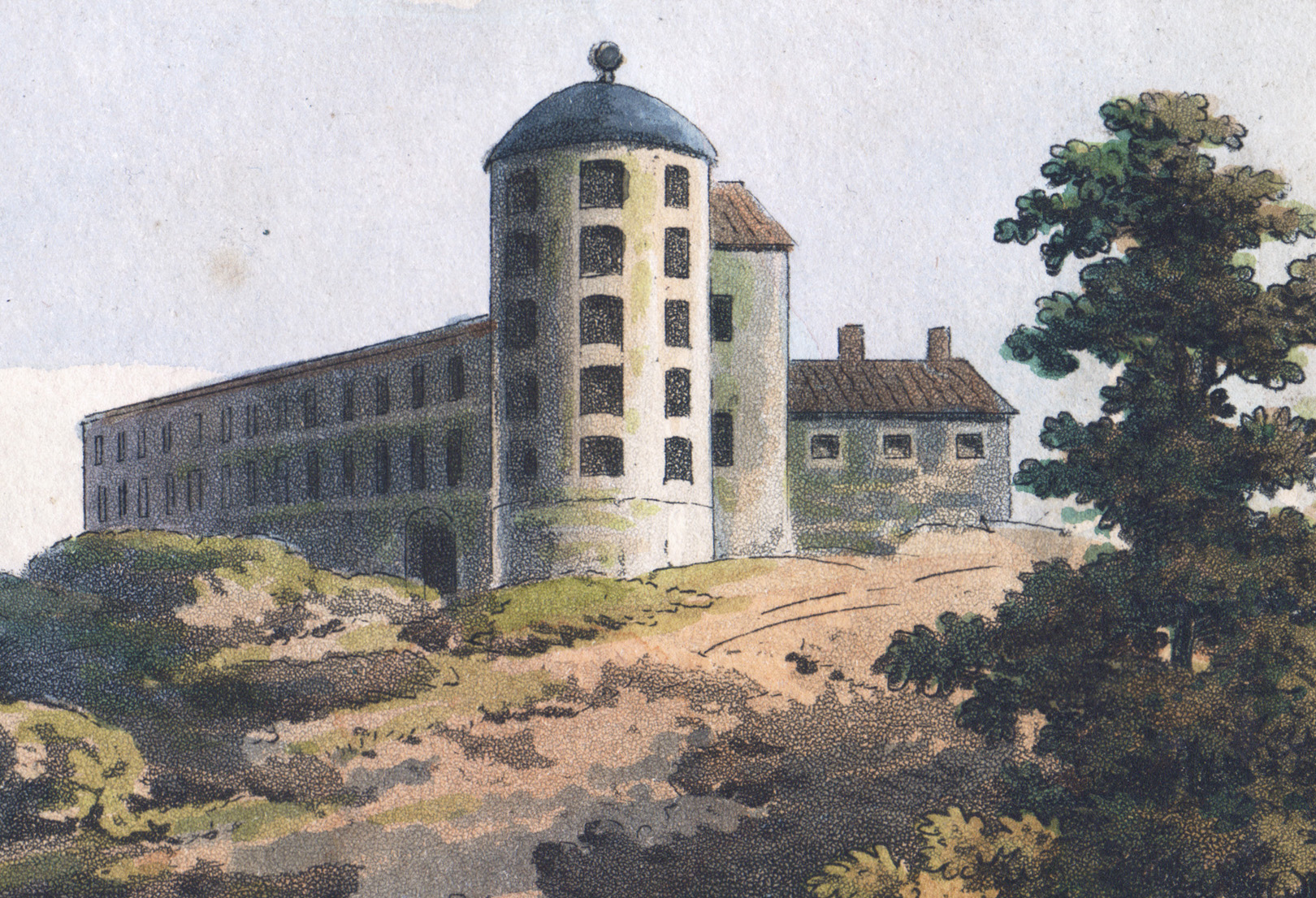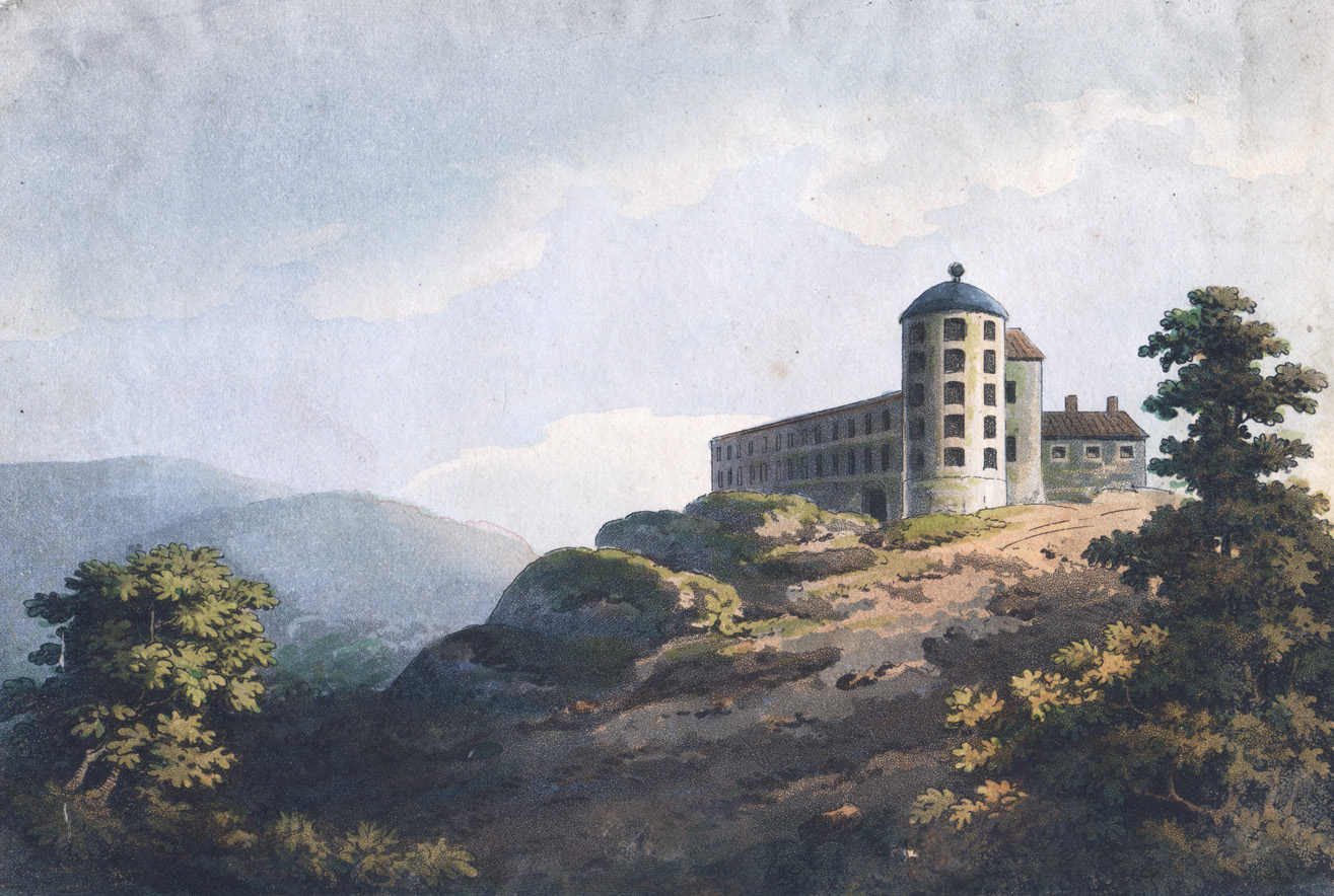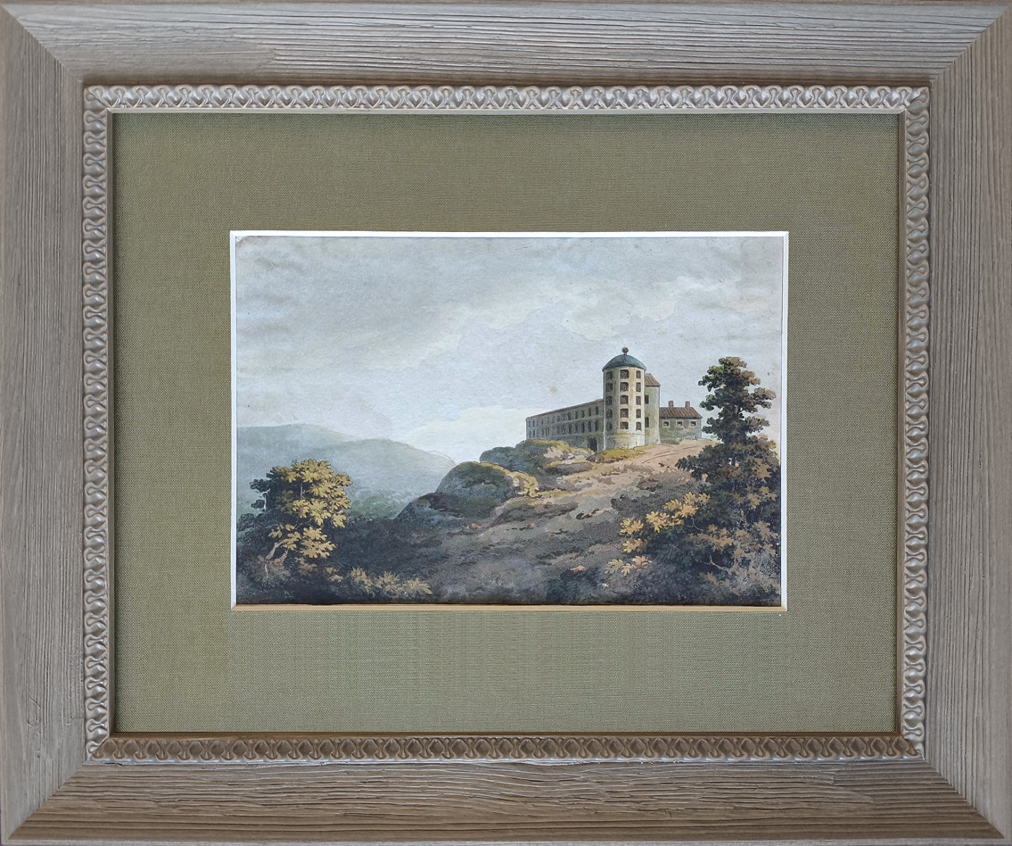 Акватинта 1800-ых гг. Уппсальский замок, пейзаж в обрамлении