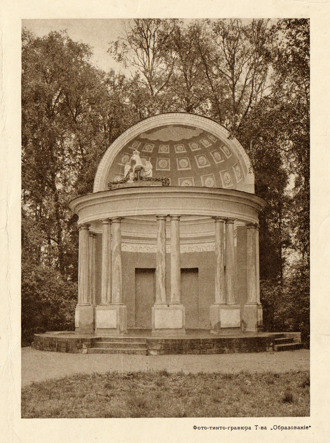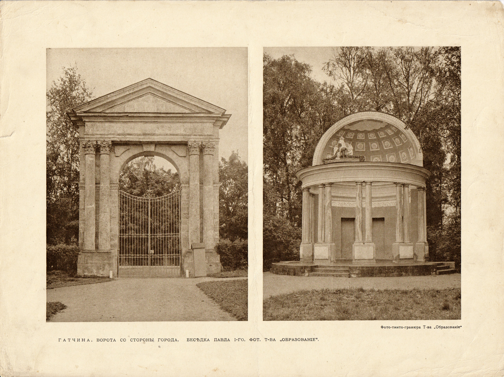 Фото-тинто-гравюра 1913 года. Беседка Павла I и ворота в Гатчине
