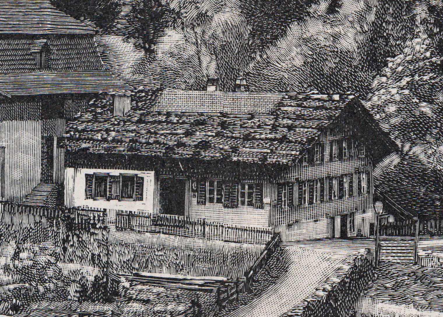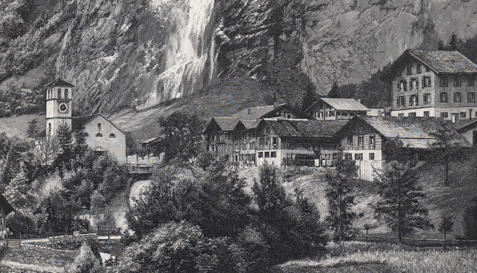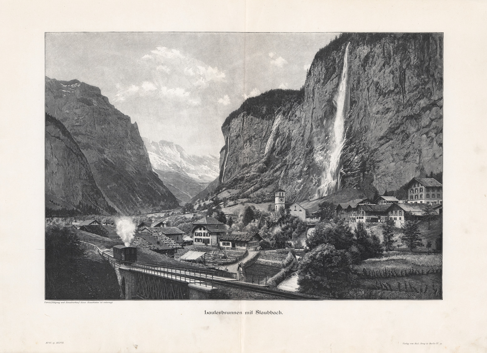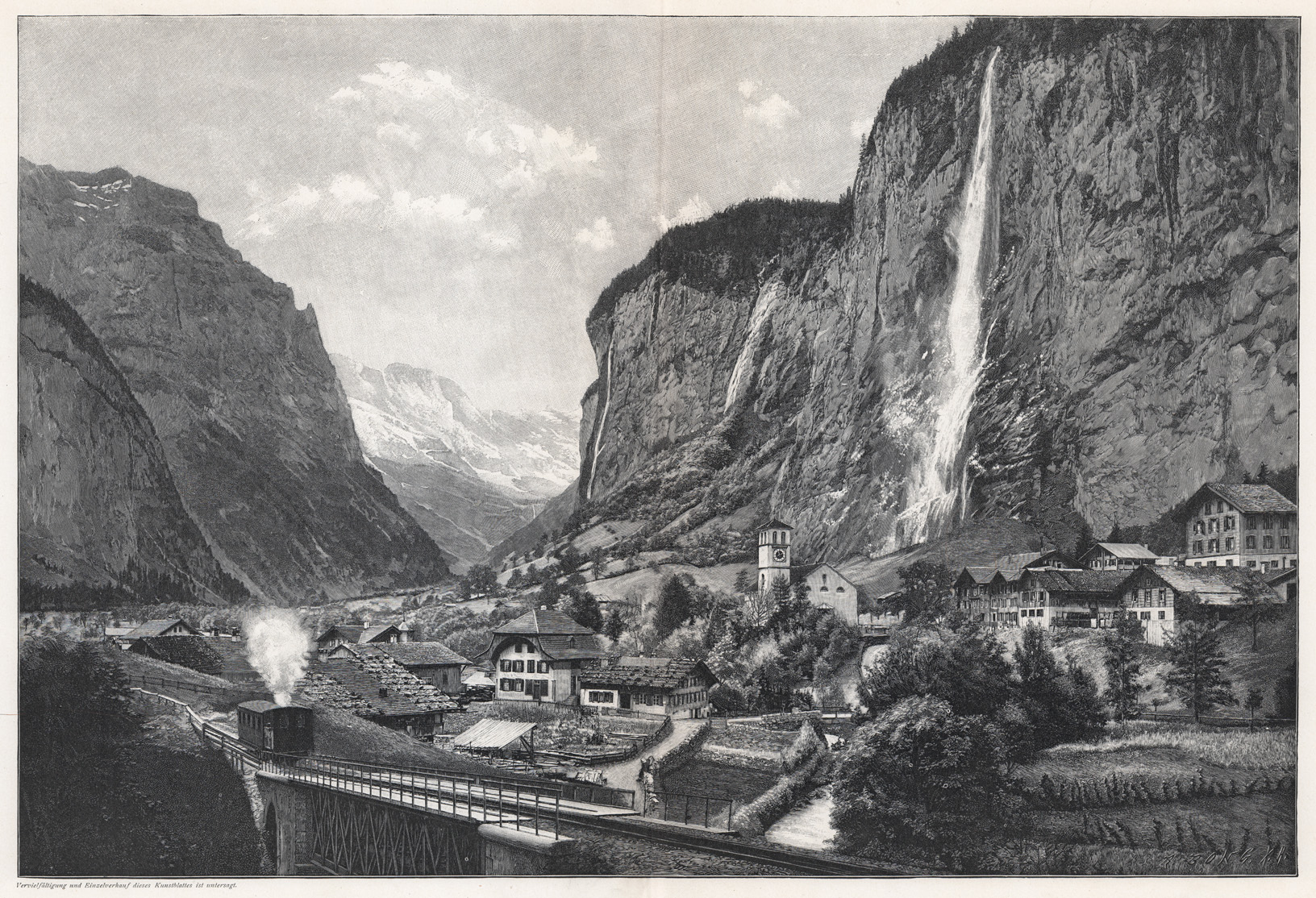 На гравюре показан водопад Штауббах у деревни Лаутербруннен в кантоне Берн, Швейцария. Высота Штауббаха составляет почти 300 метров. До апреля 2006 года он считался самым высоким водопадом Швейцарии, пока новые измерения не установили первенство Зеренбахского водопада. Когда Иоганн Вольфганг фон Гёте посетил долину Лаутербруннен в 1779 году, он сделал этот водопад знаменитым, посвятив ему своё произведение «Песнь духов над водами». Водопад посетил в 1789 году и описал Н. Карамзин в "Письма русского путешественника".