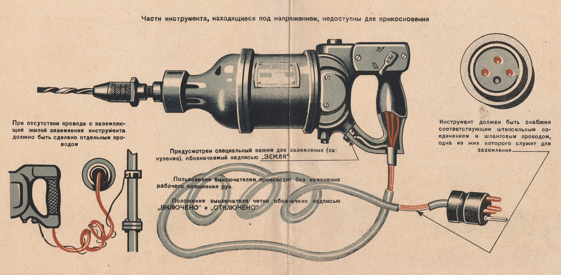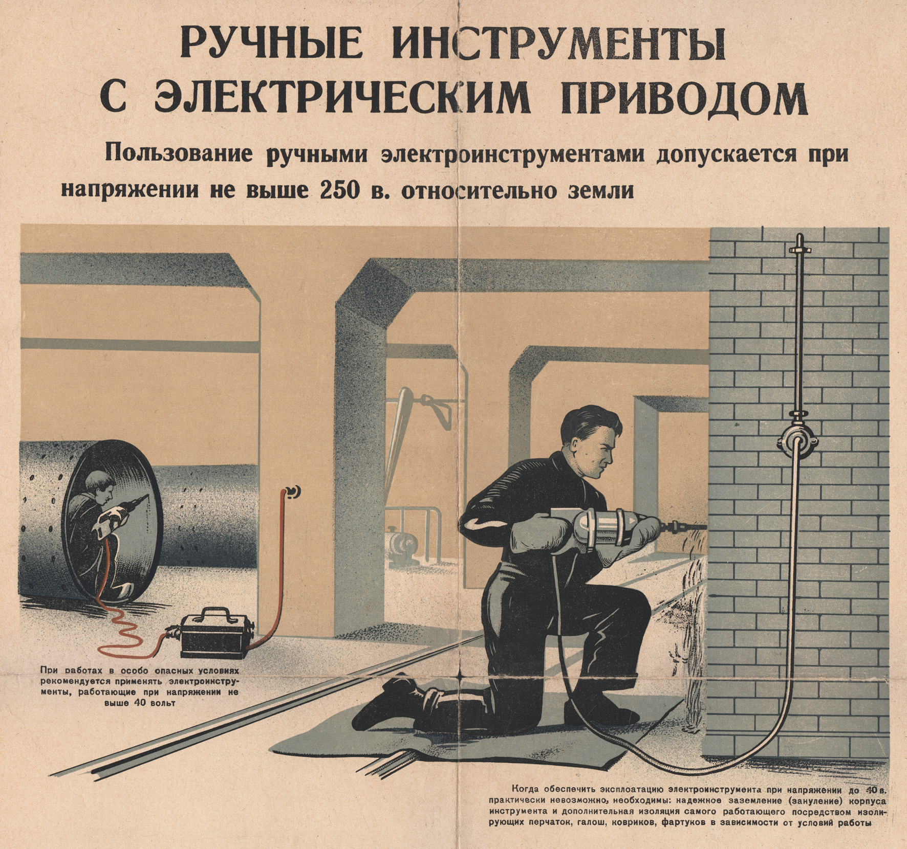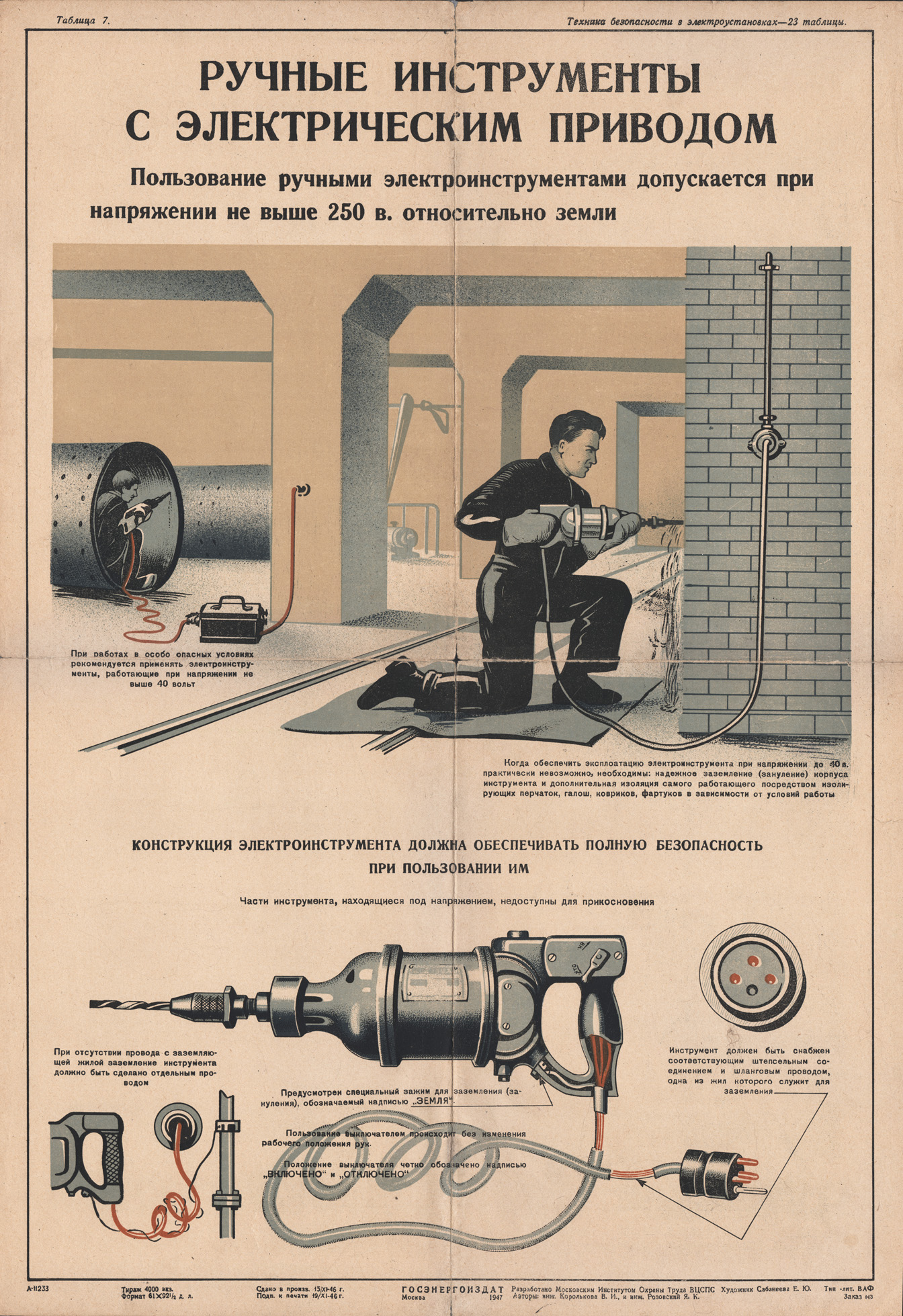 Массовое производство электроинструмента в СССР началось только после Великой Отечественной войны с 1947 года, чему и посвящен, предлагаемый Вашему вниманию плакат 1947 года - рекламе ручного электроинструмента и обучению безопасного его использования.