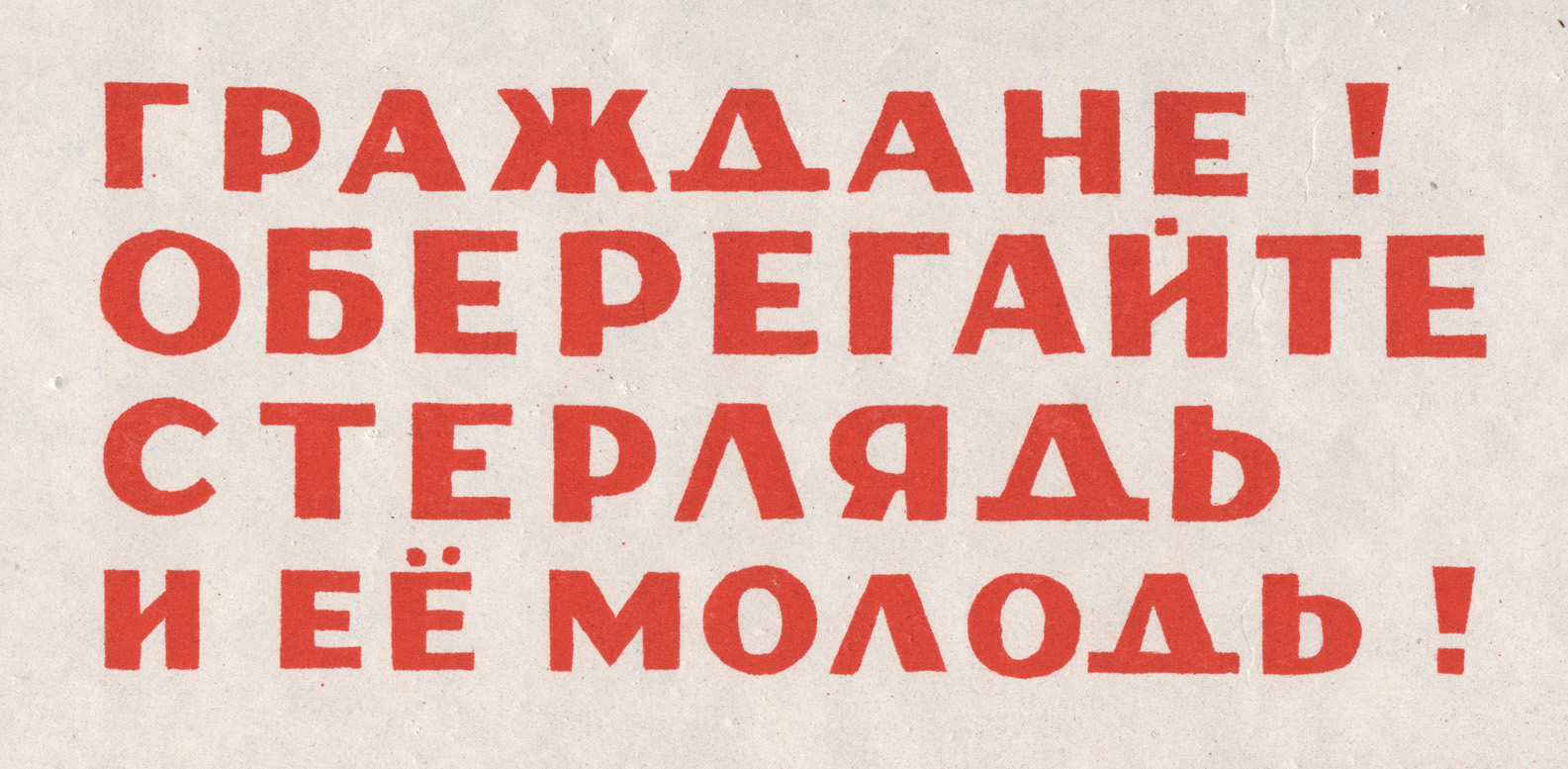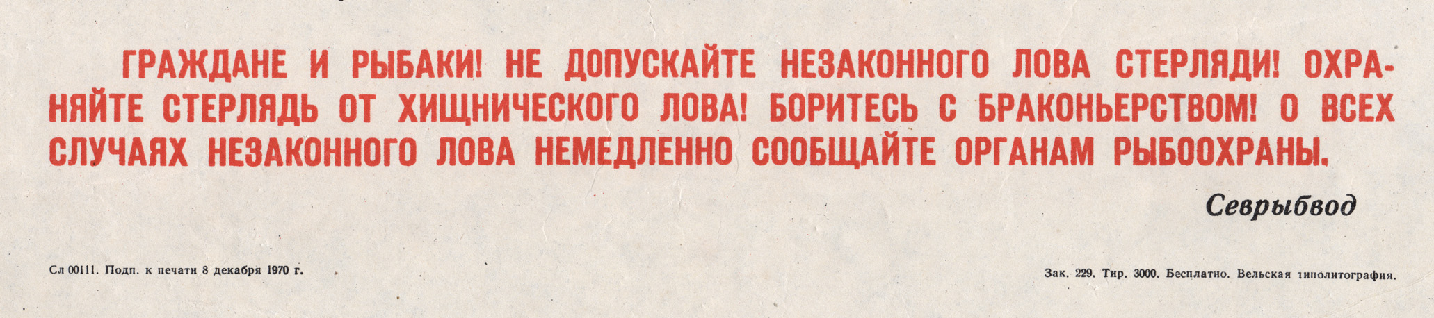 "ГРАЖДАНЕ И РЫБАКИ! НЕ ДОПУСКАЙТЕ НЕЗАКОННОГО ЛОВА СТЕРЛЯДИ! ОХРАНЯЙТЕ СТЕРЛЯДЬ ОТ ХИЩНИЧЕСКОГО ЛОВА! БОРИТЕСЬ С БРАКОНЬЕРСТВОМ! 0 ВСЕХ СЛУЧАЯХ НЕЗАКОННОГО ЛОВА НЕМЕДЛЕННО СООБЩАЙТЕ ОРГАНАМ РЫБООХРАНЫ. Севрыбвод"
