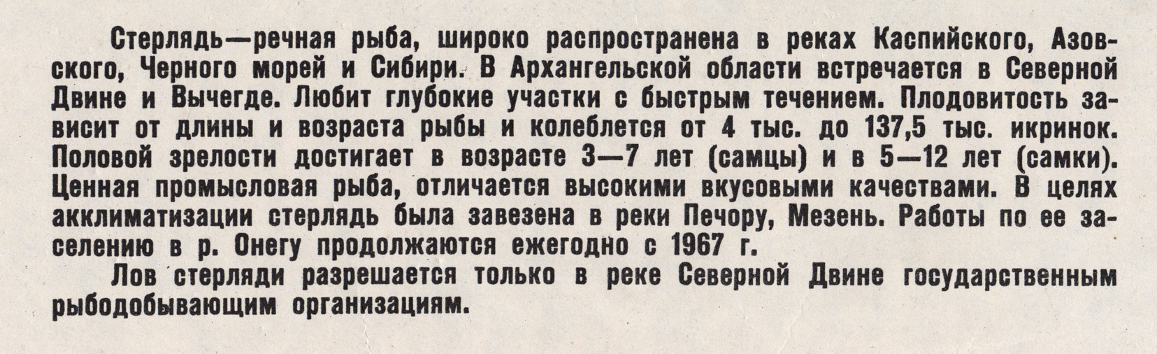 "Стерлядь— речная рыба, широко распространена в реках Каспийского, Азовского, Черного морей и Сибири. В Архангельской области встречается в Северной Двине и Вычегде. Любит глубокие участки с быстрым течением. Плодовитость зависит от длины и возраста рыбы и колеблется от 4 тыс. до 137,5 тыс. икринок. Половой зрелости достигает в возрасте 3—7 лет (самцы) и в 5—12 лет (самки). Ценная промысловая рыба, отличается высокими вкусовыми качествами. В целях акклиматизации стерлядь была завезена в реки Печору, Мезень. Работы по ее заселению в р. Онегу продолжаются ежегодно с 1967 г.