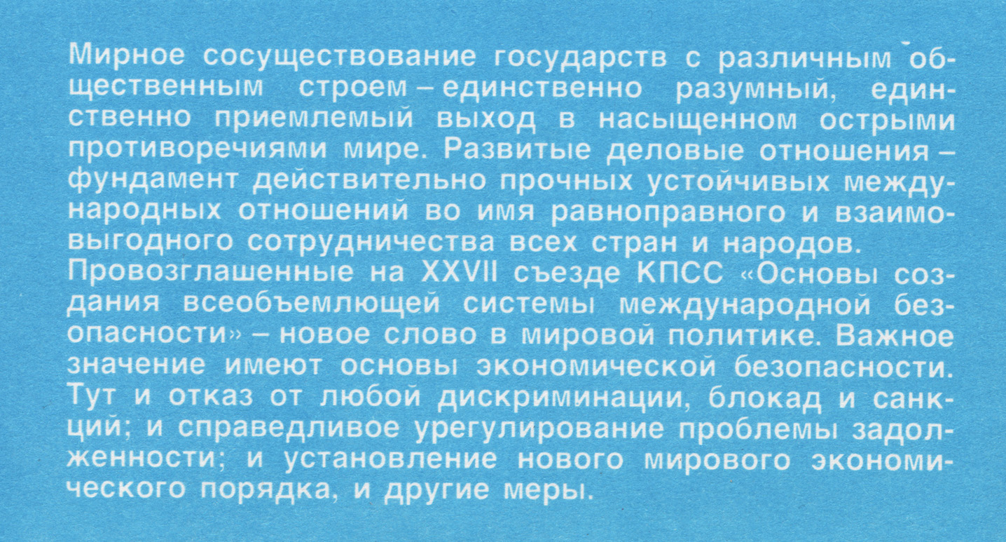 "Мирное сосуществование государств с различным общественным строем — единственно разумный, единственно приемлемый выход в насыщенном острыми противоречиями мире. Развитые деловые отношения -— фундамент действительно прочных устойчивых международных отношений во имя равноправного и взаимовыгодного сотрудничества всех стран и народов.