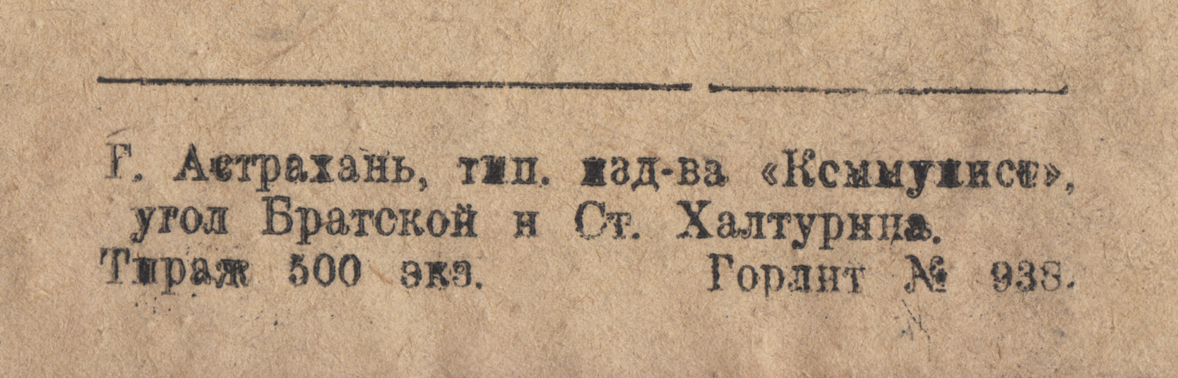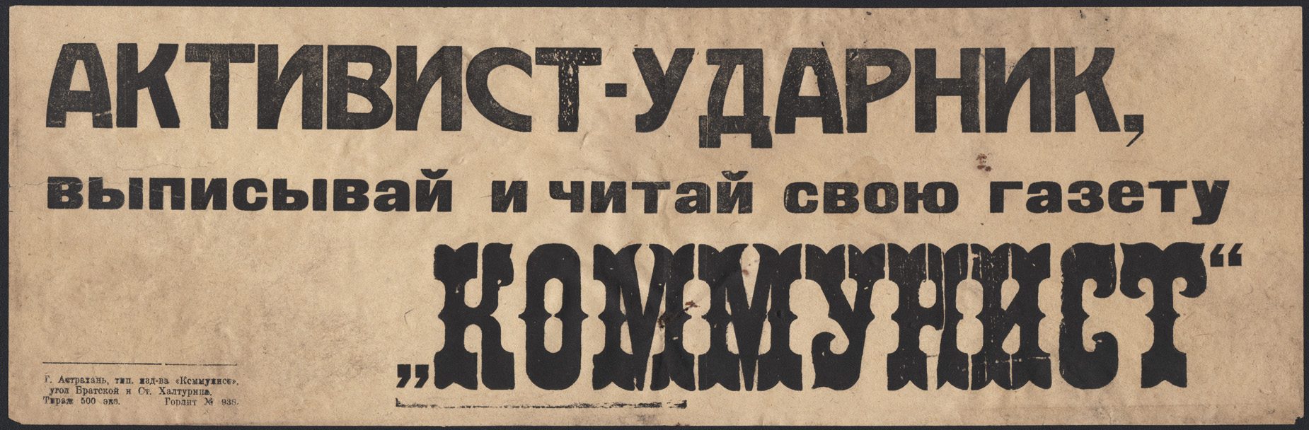 Под названием «Коммунист» с 9 июня 1918 года по 27 февраля 1944 года выходила общественно-политическая газета Астраханского Губернского Комитета Российской Коммунистической Партии. В 1944 году издание переименовали и оно стало носить название - газета "Волга". В 1918-1920-ых гг для написания названия (логотипа) газеты использовался необычный ажурный шрифт, использованный и на предлагаемом Вашему вниманию рекламном плакате. На нижнем фото показан номер газеты "Коммунист" за 1919 год (в стоимость лота не входит).