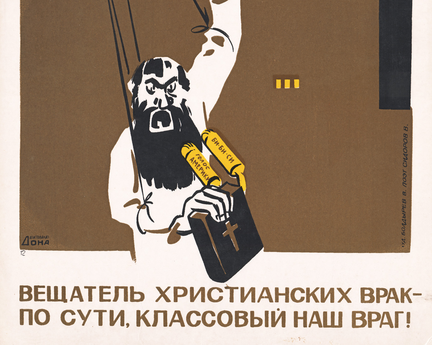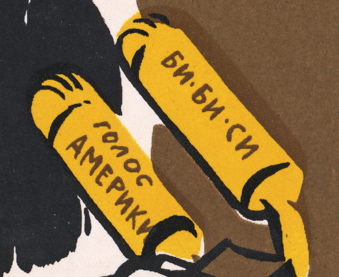 Размер плаката 55 х 35 см. Редкое малотиражное региональное издание. На момент атрибуции на профильных онлайн площадках и в цифровых галереях не найдено ни одного повторного экземпляра этого тиража. Чистая обратная сторона, плотный картон. Советский агитационный плакат, направленный на борьбу с американской пропагандой, осуществляемой через вещание западных радио-станций (в 2017 году внесенных Минюстом РФ в реестр иностранных агентов). Художник В.Болдырев, поэт В. Сидоров, Агитплакат Дона, 1960-70е гг.