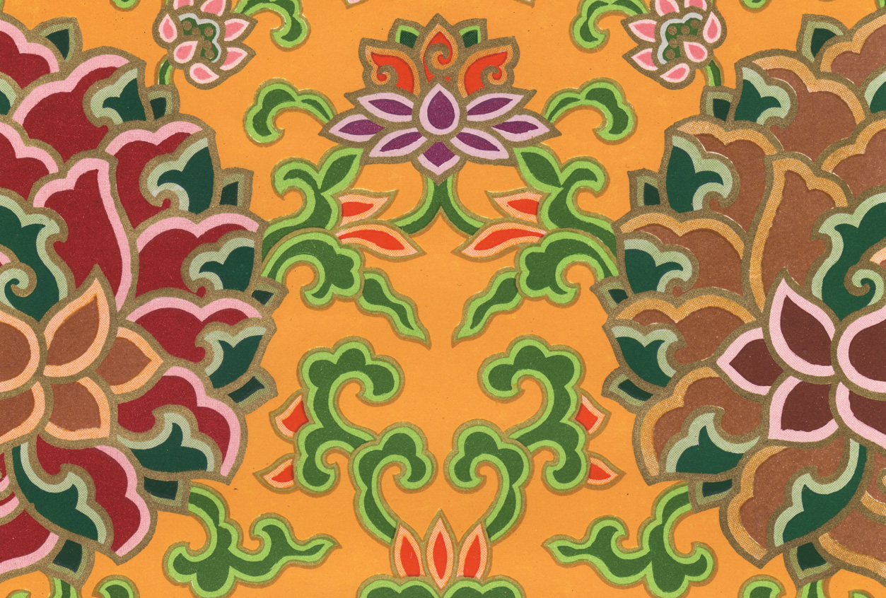Размер листа 36,6 х 25,9 см. Редкость. Лист с изображением уникального узора традиционной китайской облачной парчи Юньцзинь (ткани из шелка с нитями из серебра и золота) издания "Узор парчи", составитель Нанкинский научно-исследовательский институт Юньцзинь, редактор Чэнь Чжифо, издатель "Книжный магазин Синьхуа", отпечатано в типографии издательства "Китайское классическое искусство", в Пекине, в 1959 году, тиражом 1500 экземпляров.