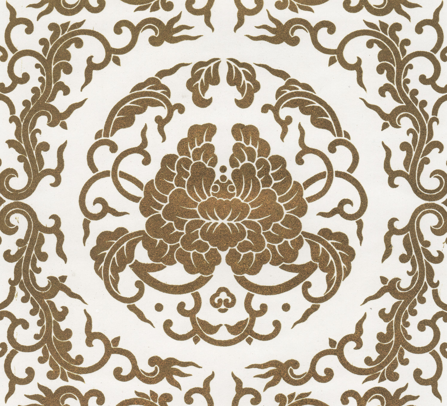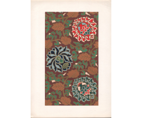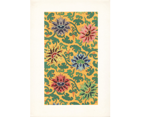 Размер листа 36,6 х 25,9 см. Редкость. Лист с изображением уникального узора традиционной китайской облачной парчи Юньцзинь (ткани из шелка с нитями из серебра и золота) издания "Узор парчи", составитель Нанкинский научно-исследовательский институт Юньцзинь, редактор Чэнь Чжифо, издатель "Книжный магазин Синьхуа", отпечатано в типографии издательства "Китайское классическое искусство", в Пекине, в 1959 году, тиражом 1500 экземпляров.
